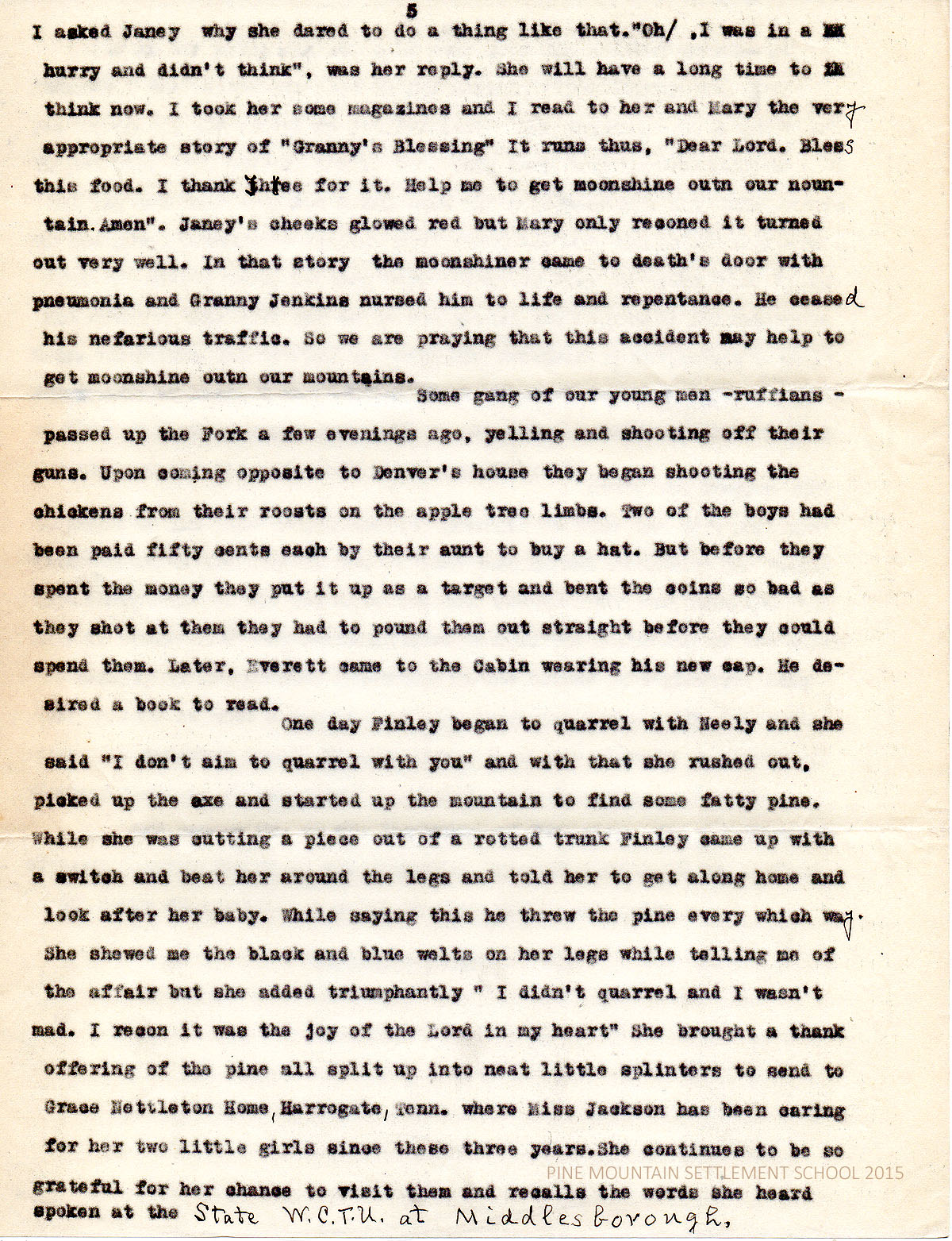 One day Finley began to quarrel with Neely and she said “I don’t aim to quarrel with you” and with that she rushed out, picked up the axe and started up the mountain to find some fatty pine. While she was cutting a piece out of a rotted trunk Finley came up with a switch and beat her around the legs and told her to get along home and look after her baby. While saying this he threw the pine every which way. She showed me the black and blue welts on her legs while telling me of the affair but she added triumphantly “I didn’t quarrel and I wasn’t mad. I reckon it was the joy of the Lord in my heart.” She brought a thank offering of the pine all split up into neat little splinters to send to Grace Nettleton Home, Harrogate, Tenn where Miss Jackson has been caring for her two little girls since these three years. She continues to be so grateful for her chance to visit them and recalls the words she heard spoken at the State WCTU at Middlesborough.
