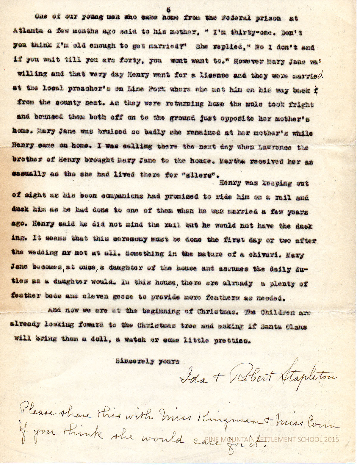 One of our young men who came home from the Federal prison at Atlanta a few months ago said to his mother, “I’m thirty-one. Don’t you think I’m old enough to get married?” She replied, “No I don’t and if you wait till you are forty, you won’t want to.” However Mary Jane was willing and that very day Henry went for a license and they were married at the local preacher’s on Line Fork where she met him on his way back from the county seat. As they were returning home the mule took fright and bounced them both off on to the ground just opposite her mother’s home. Mary Jane was bruised so badly she remained at her mother’s while Henry came on home. I was calling there the next day when Lawrence the brother of Henry brought Mary Jane to the house. Martha received her as casually as tho she had lived there for “allers.”