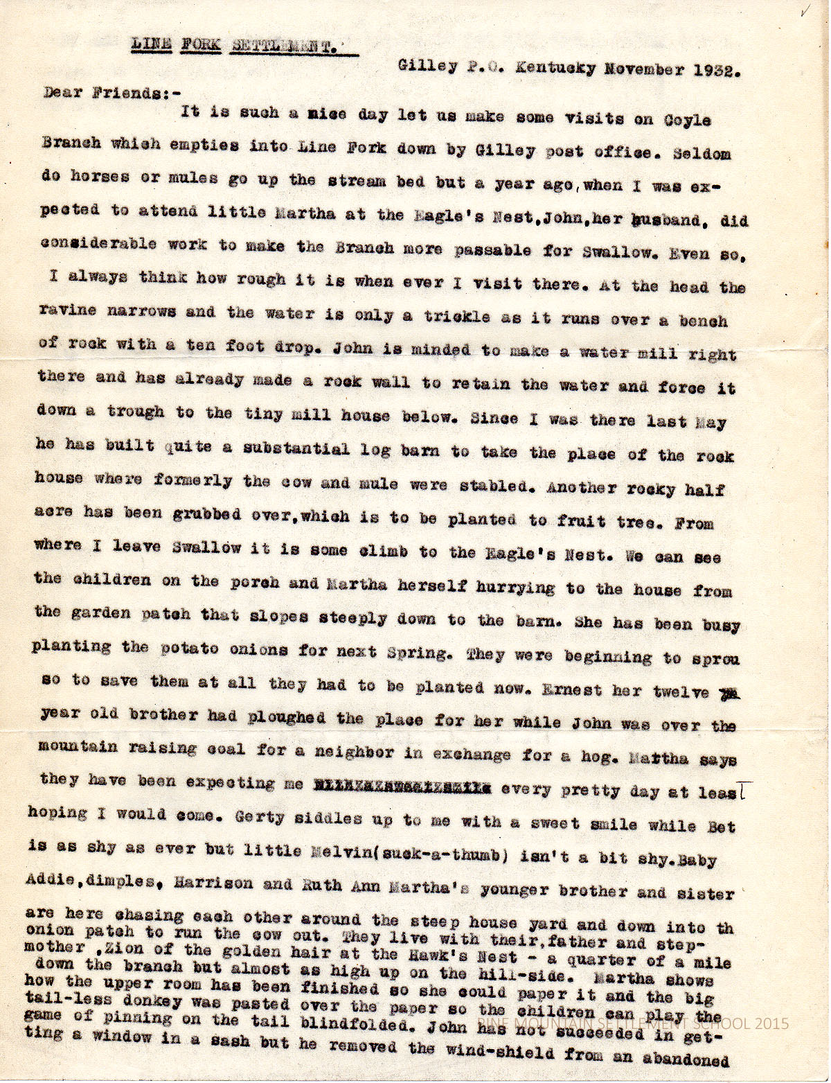 TAGS: Dr. Ida Stapleton report 1932 November, Line Fork Settlement, Coyle Branch, Gilley KY, horses, community people, Thanksgiving, moonshine, food, Grace Nettleton Home, chivaree