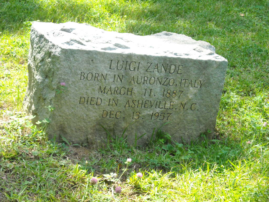 “Find A Grave Index,” database, FamilySearch (https://familysearch.org/ark:/61903/1:1:QVKX-H9QG : 13 December 2015), Luigi Zande, 1957; Burial, Asheville, Buncombe, North Carolina, Unit.ed States of America, Riverside Cemetery; citing record ID 40115150, Find a Grave, http://www.findagrave.com. Internet resource.