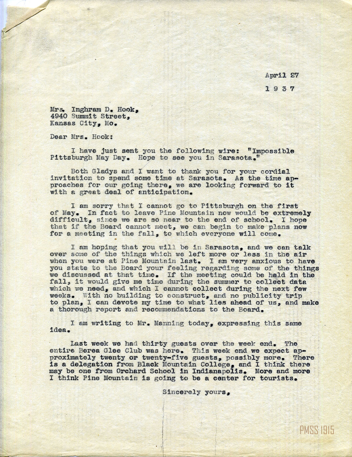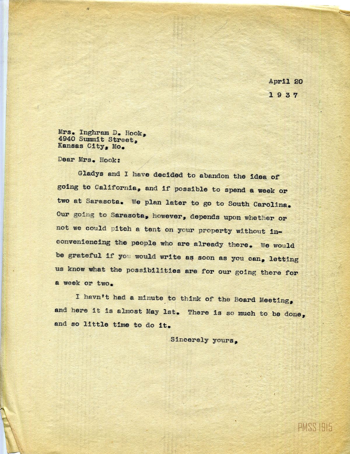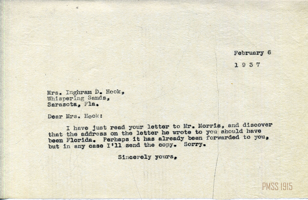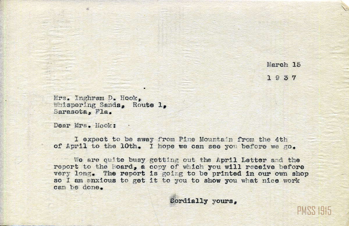 MARY ROCKWELL HOOK Correspondence 1937