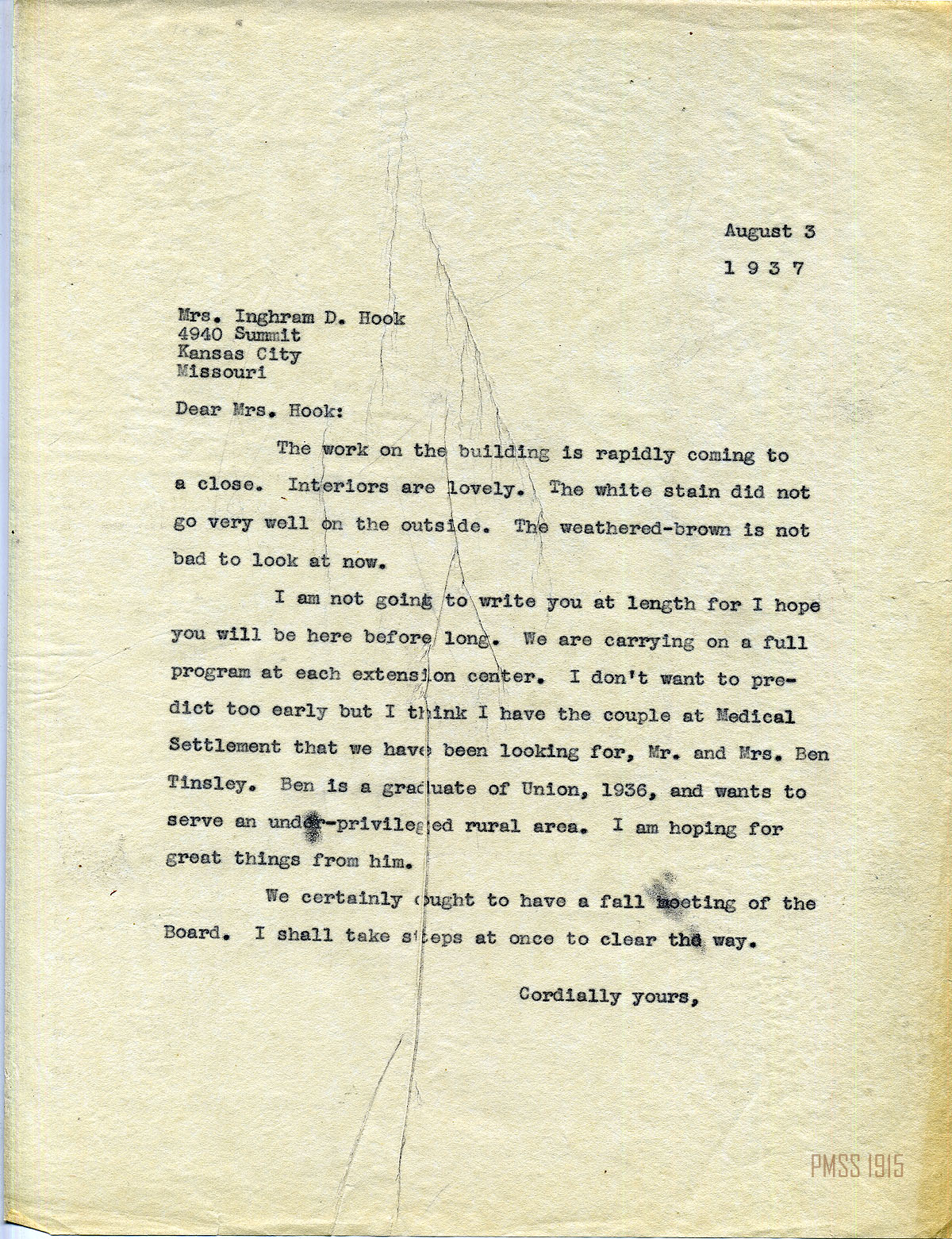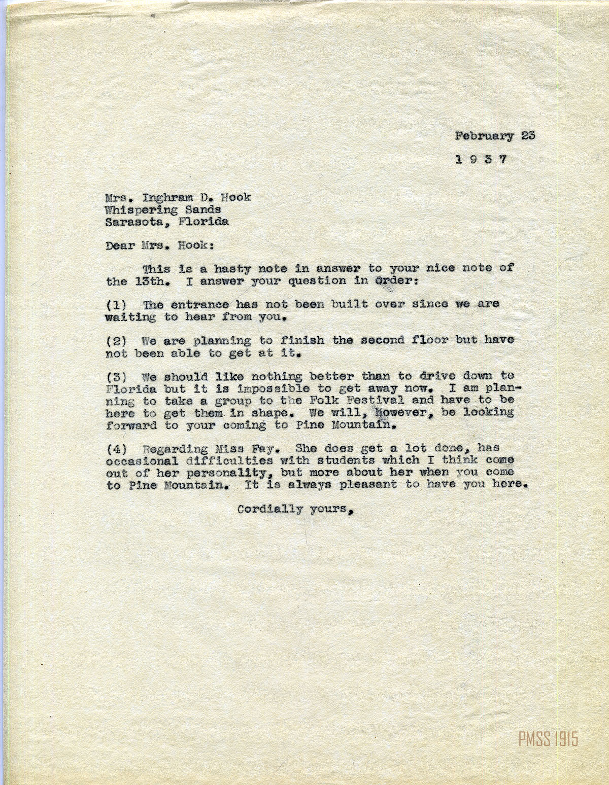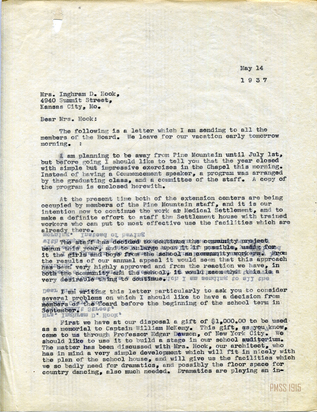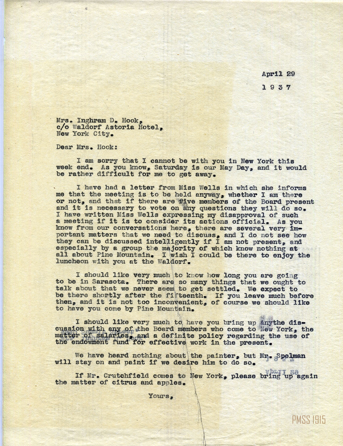 MARY ROCKWELL HOOK Correspondence 1937