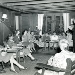 - Mr. and Mrs. Benjamin (6th and 7th from left) at staff meeting in Director Benjamin’s house (Zande House), late 1940s. (left to right) Gladys Hill, Fern Hayes, Ruth Smith, Margaret Motter, Mr. Benjamin, Mrs. Benjamin. [X_100_workers_2593_mod]