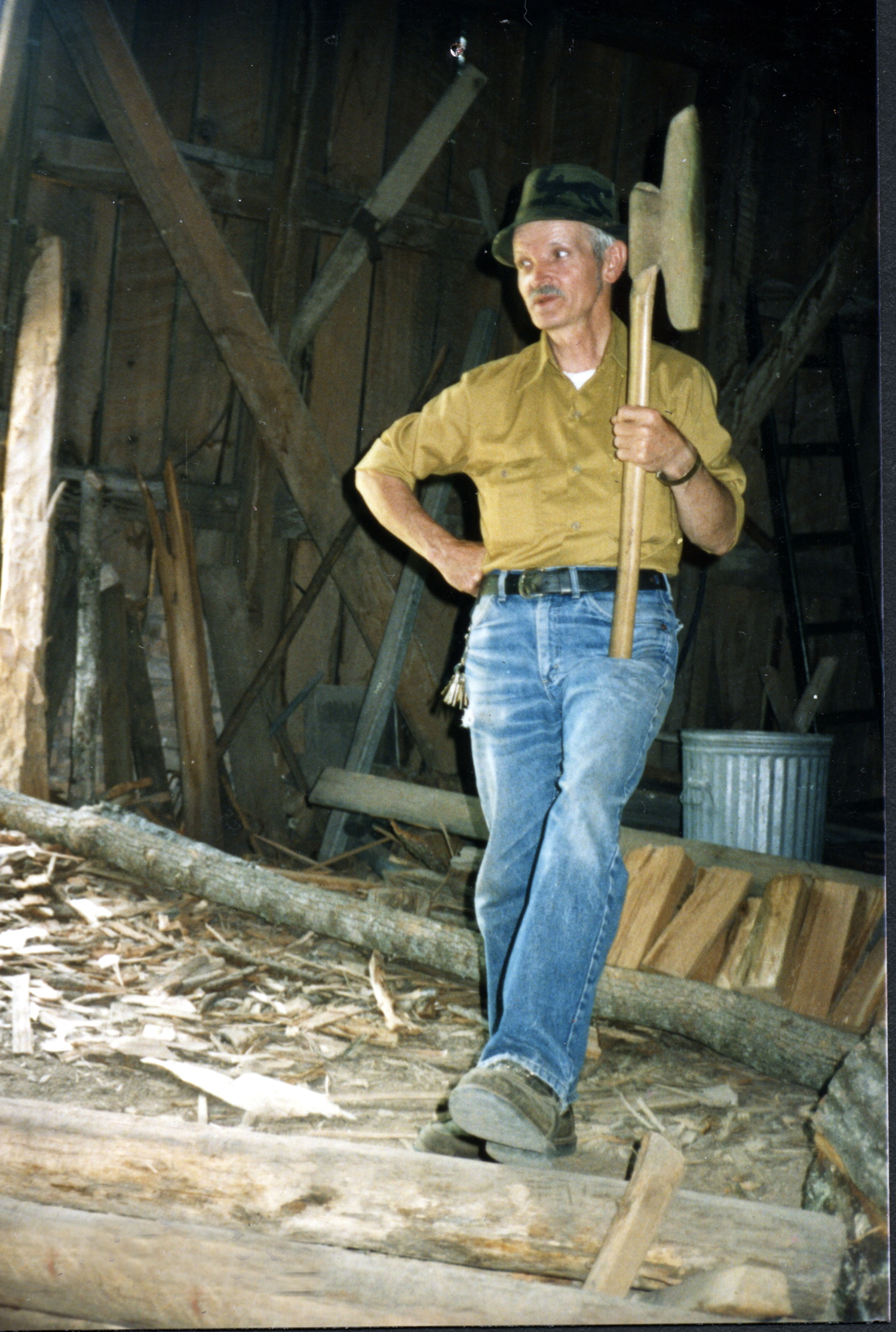 - Matt Boggs demonstrating the use of traditional tools for splitting shingles. [X_100_workers_2668_mod.jpg]