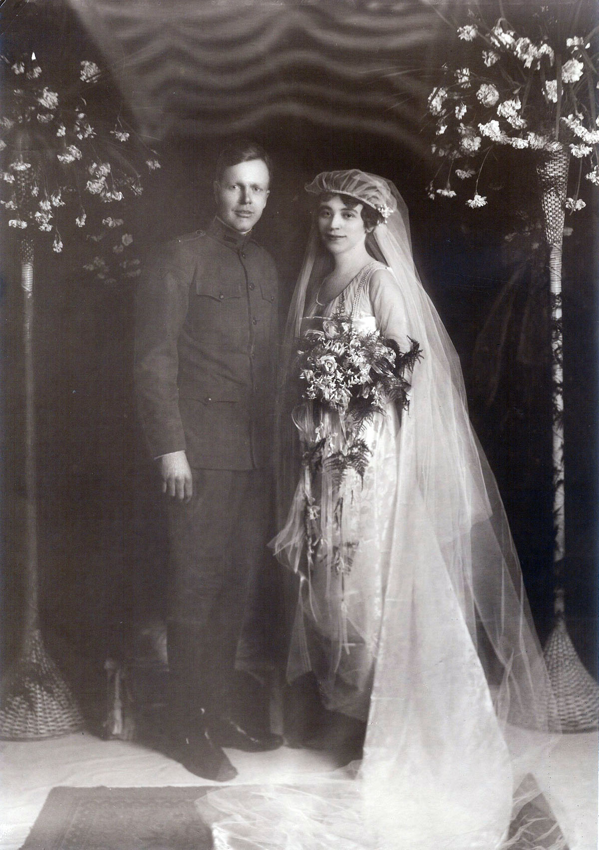 - 16 January 1918; at Methodist Episcopal Church, Sidell, Illinois; wedding of Celia Cathcart & Caryl Holton; Celia & Caryl; Caryl in military uniform; William (Bill) Holton wrote on back “CAH/CCH Wedding”