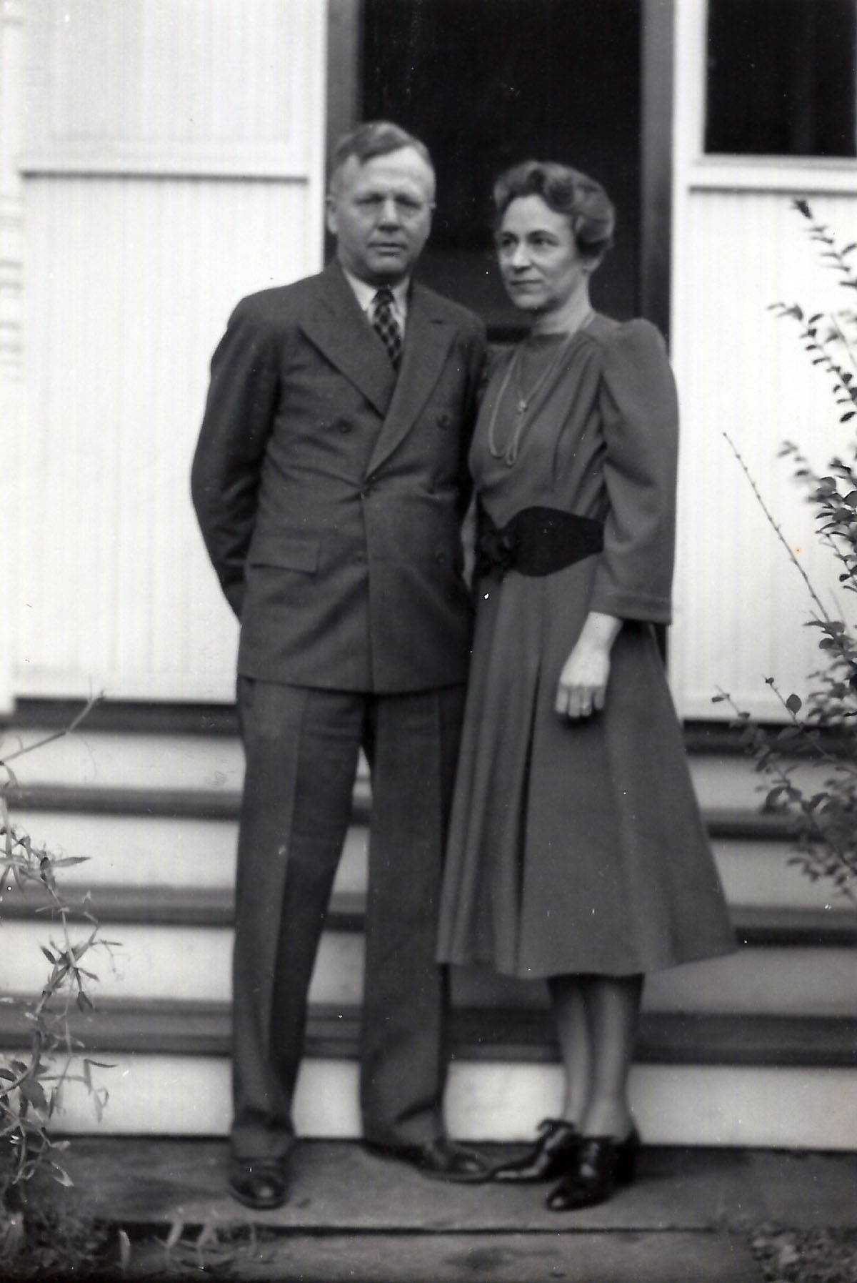 - ca 1938; at Caryl & Celia Cathcart’s, 128 East First Street, London, Ohio; Caryl & Celia Holton; David Holton wrote on back “Father & Mother – / Caryl & Celia Holton / outside the back porch / at 128 E. First ST / 1938?”; “2720” also written on back