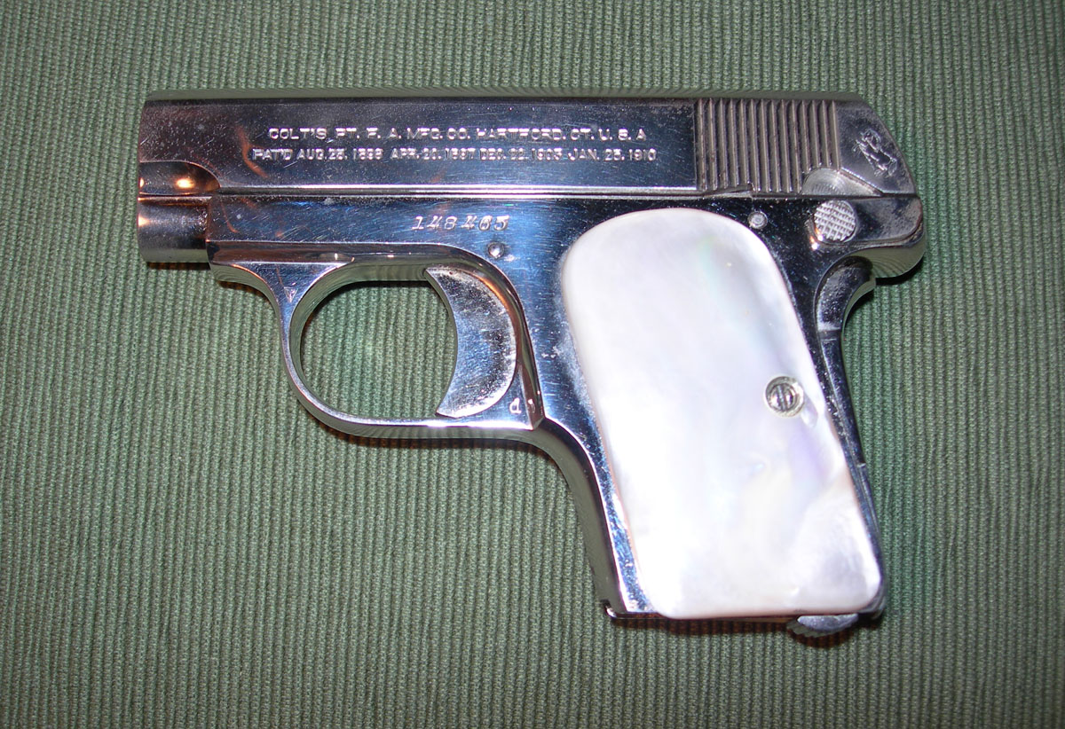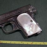 - 17 October 2007; Colt Model 1908 Hammerless Semi-Auto Pistol, .25ACP; Celia Cathcart Holton carried this pistol while she traveled alone about 1918 as she raised money to build the Pine Mountain, Kentucky road; mother of pearl handle; Caryl Holton gave the pistol to Hap McFadden, tenant on Holton farm; Hap’s widow returned it to William (Bill) Holton after Hap’s death; now in possession of Thomas (Tom) Holton, Dublin, Ohio