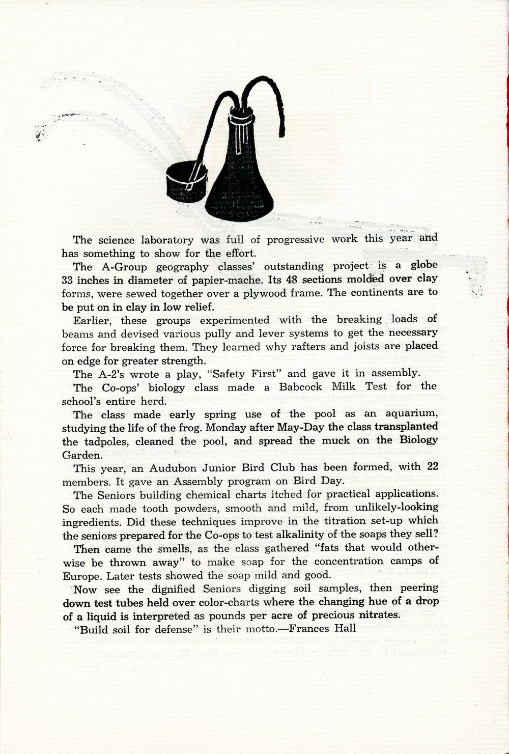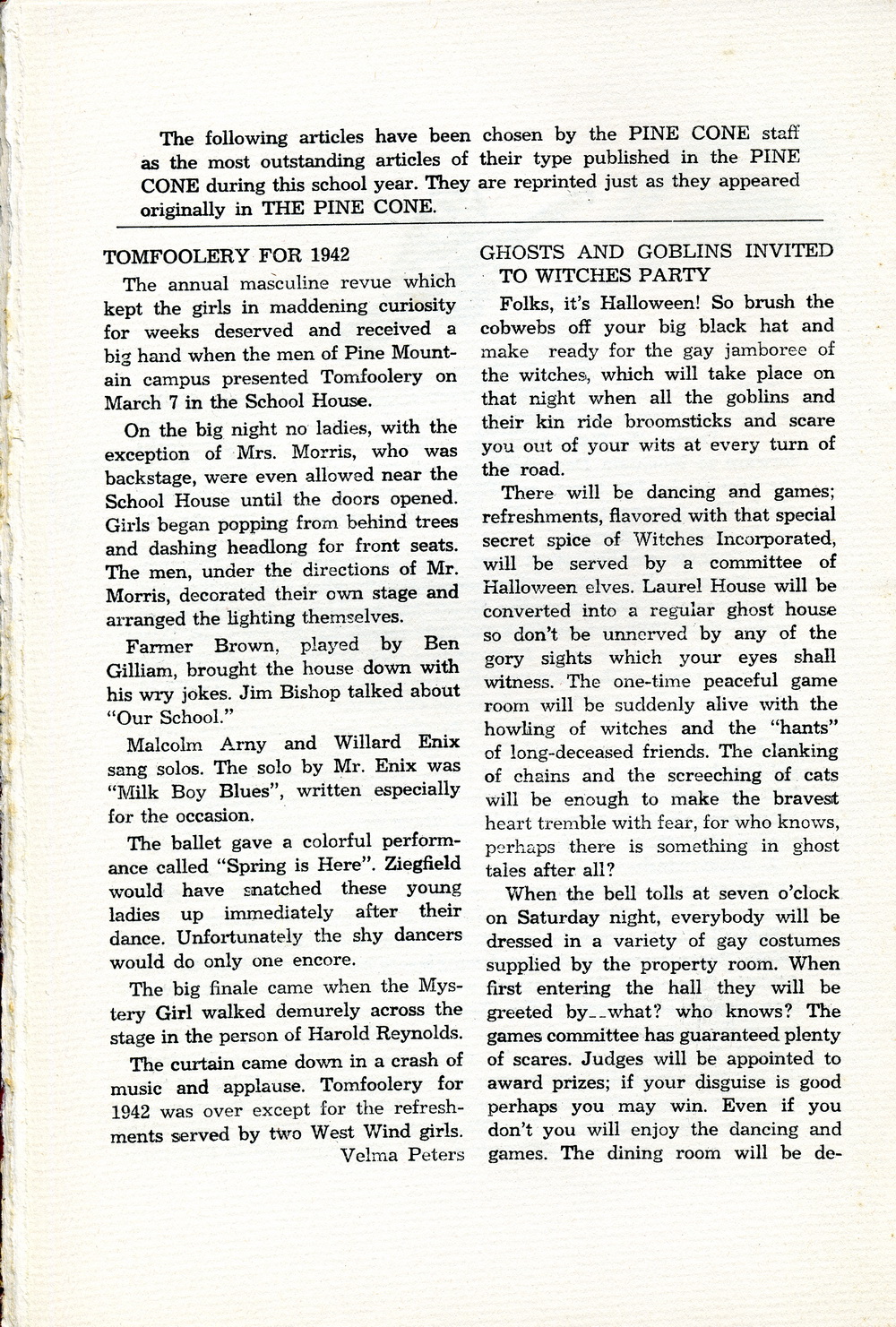 Staff of Pine Cone The Year in Review Tomfoolery for 1942 Ghosts and Goblins Invited to Witches Party Editorial The Joys of Rural Life Sports. Good Sportsmanship Ready! Action! Camera! [Ray and Virginia “Jinny” Garner filming] Book Report Laurel House Groundhog and Sweetspuds The Making of a King [a play] Biographies of the Graduating Class of 1942 Senior Prayer