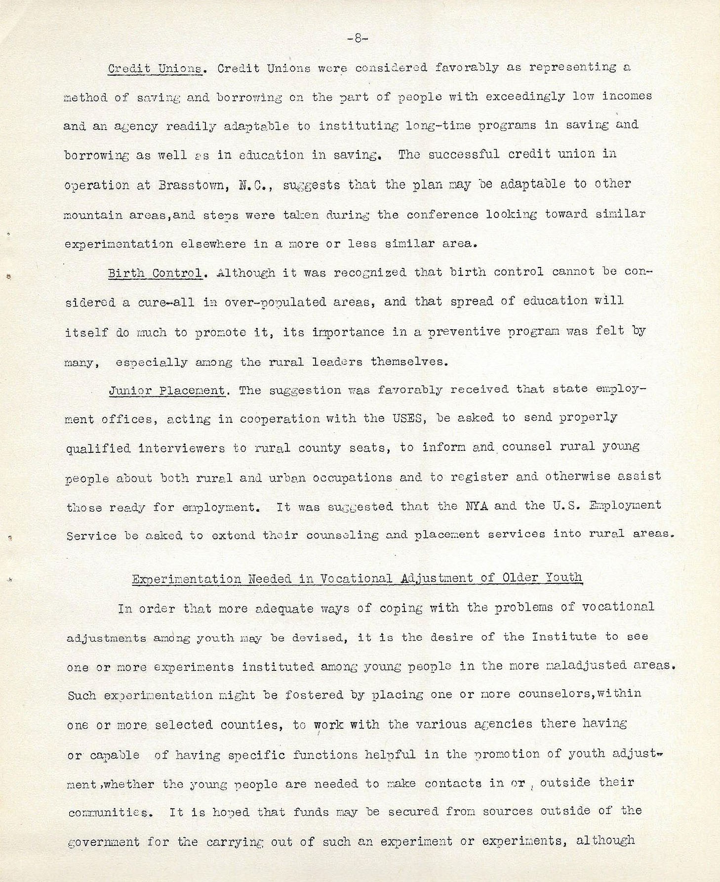 Credit Unions. Credit unions were considered favorably as representing a method of saving and borrowing on the part of people with exceedingly low incomes and an agency readily adaptable to instituting long-time programs in saving and borrowing as well as in education in saving. The successful credit union in operation at Brasstown, N.C., suggests that the plan may be adaptable to other mountain areas, and steps were taken during the conference looking toward similar experimentation elsewhere in a more or less similar area.
