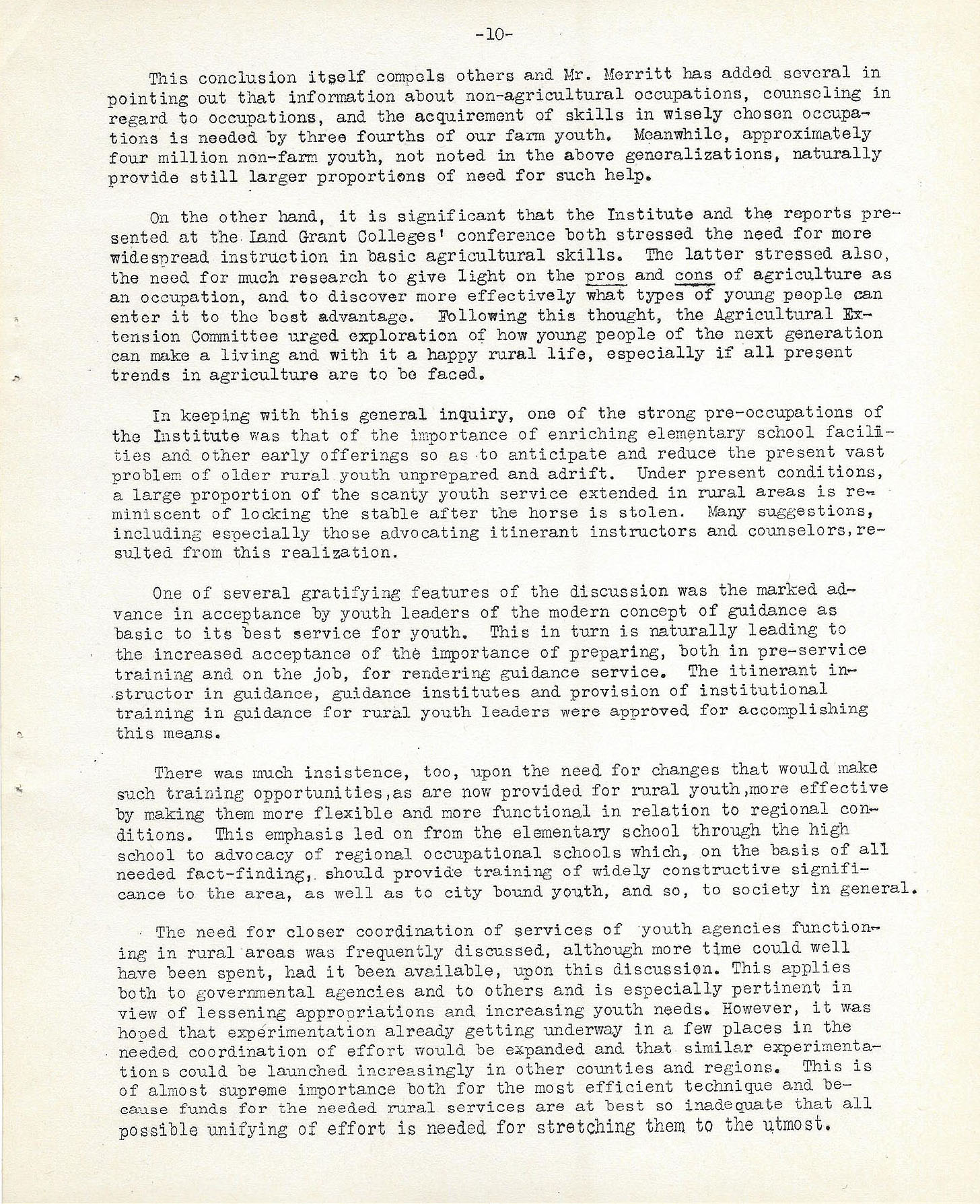On the other hand, it is significant that the Institute and the reports presented at the Land Grant Colleges’ conference both stressed the need for more widespread instruction in basic agricultural skills. The latter stressed also, the need for much research to give light on the pros and cons of agriculture as an occupation, and to discover more effectively what types of young people can enter it to the best advantage. Following this thought, the Agricultural Extension Committee urged exploration of how young people of the next generation can make a living and with it a happy rural life, especially if all present trends in agriculture are to be faced.