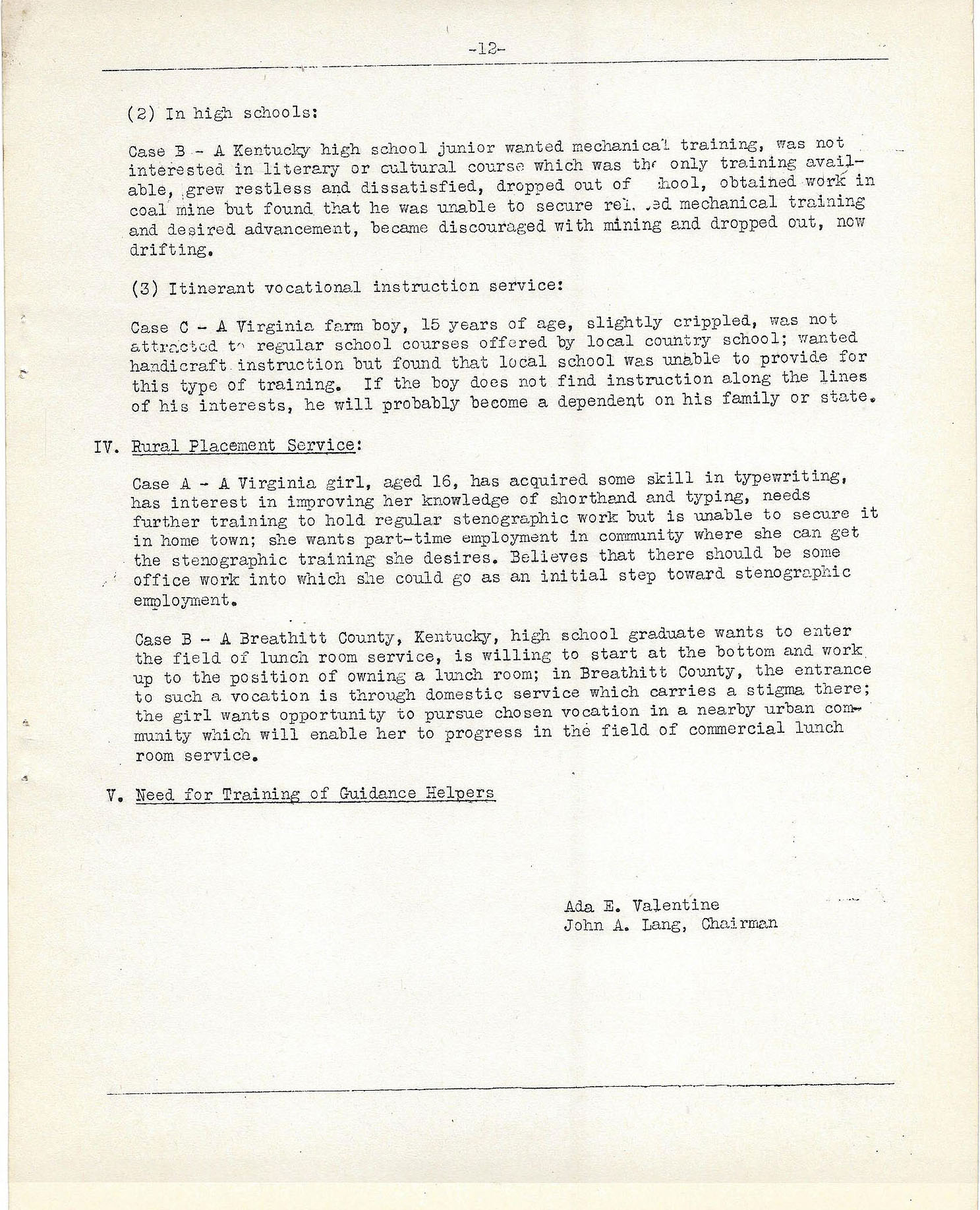 Case B – A Virginia lad with much interest in mechanical activities and with energy and ambition found his school training uninteresting and unattractive; he particularly wanted to know what devices “back of the typewriter made it tick”; desired guidance and training in mechanical fields but was unable to secure such an opportunity; attempted through local opportunities to realize his desires but continued to find a lack of vocational guidance and training.
