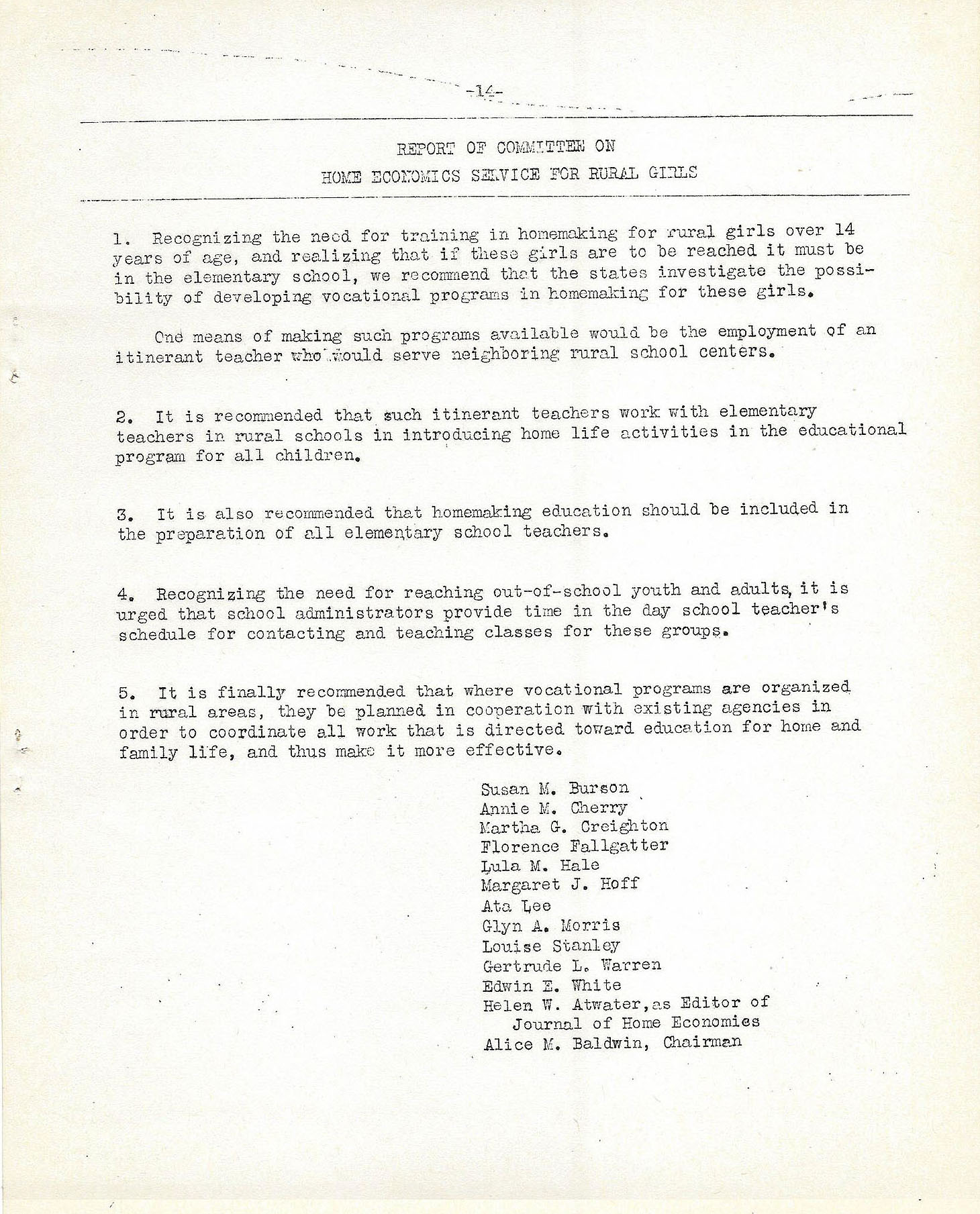 1. Recognizing the need for training in homemaking for rural girls over 14 years of age, and realizing that if these girls are to be reached it must be in the elementary school, we recommend that the states investigate the possibility of developing vocational programs in homemaking for these girls.