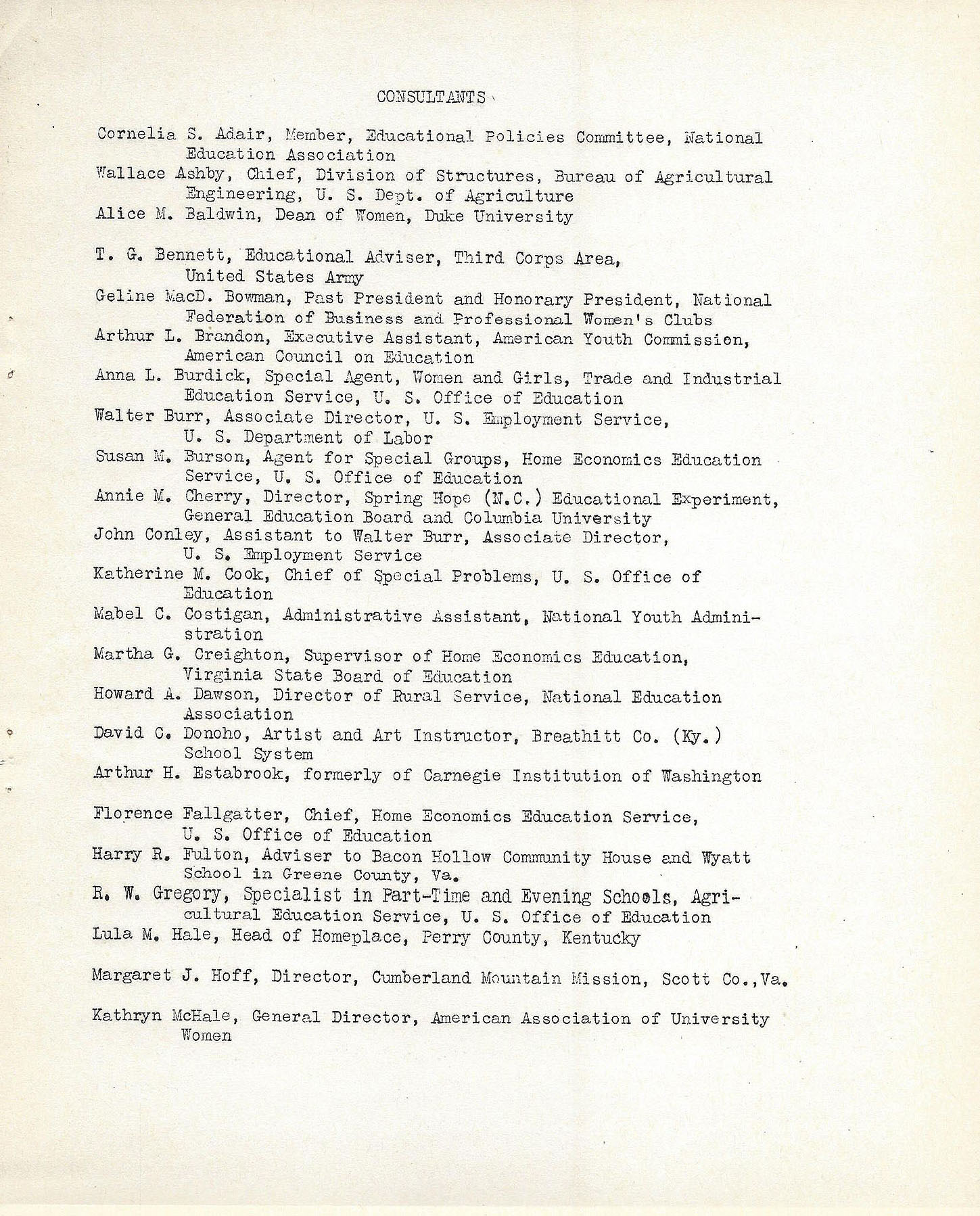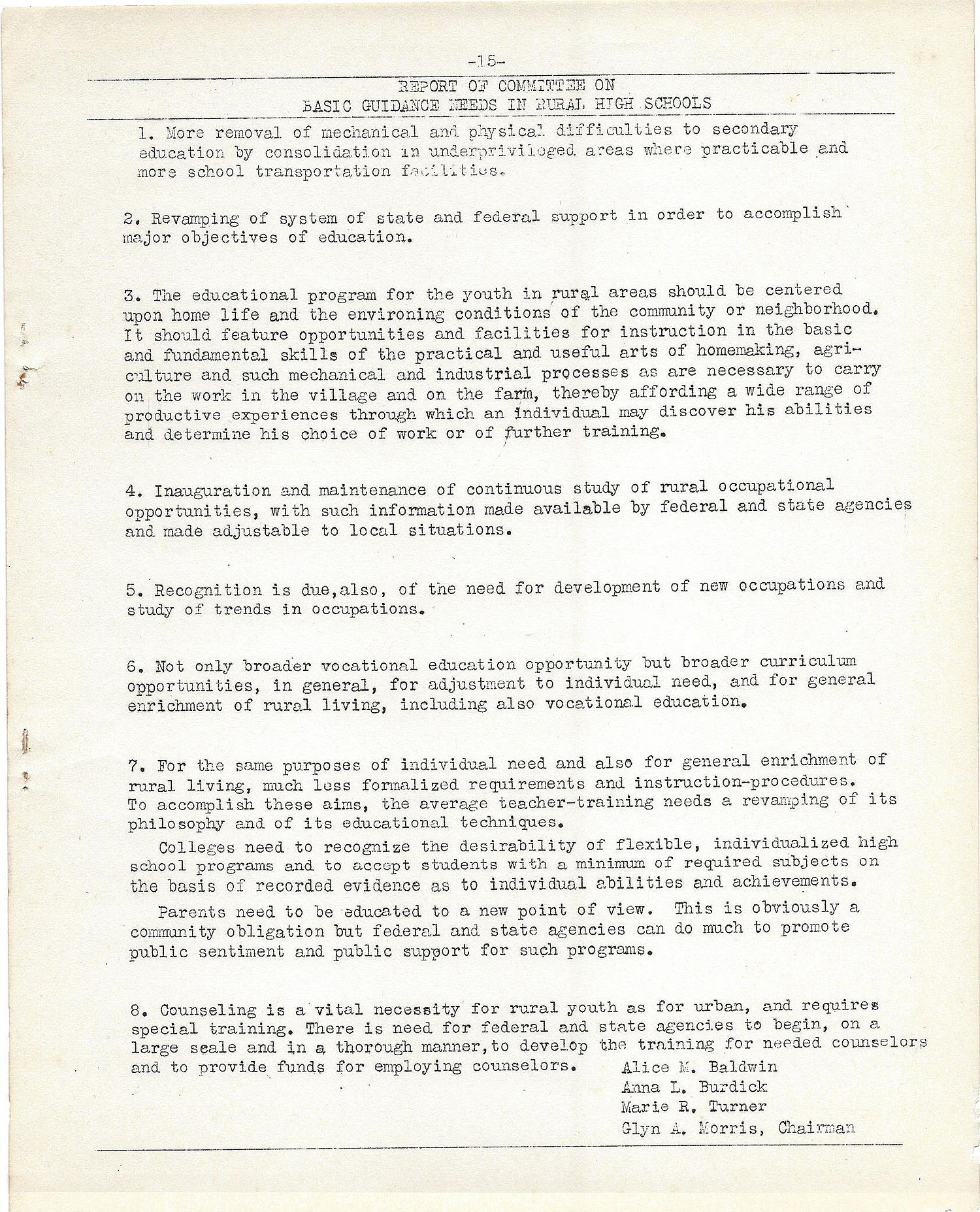 TAGS: 1937 Rural Youth Guidance Institute – Findings ; consultants ; Alliance for Guidance of Rural Youth ; rural youth needs ; vocational counseling ; vocational education ; youth-serving agencies ; guidance programs ; youth migration to city ; agriculture as a vocation ; CCC camps ; rural non-farm opportunities ; U.S. Employment Service ; NYA ; training for rural living ; Homeplace ; 4-H Club ; teacher-training ; George-Deen Act ; itinerant counselors ; experimental regional vocational schools ; out-of-school youth ; handicapped children ; credit unions ; birth control ; U.S. Employment Service ; regional occupational schools ; case studies ; homemaking education ; education of parents ;