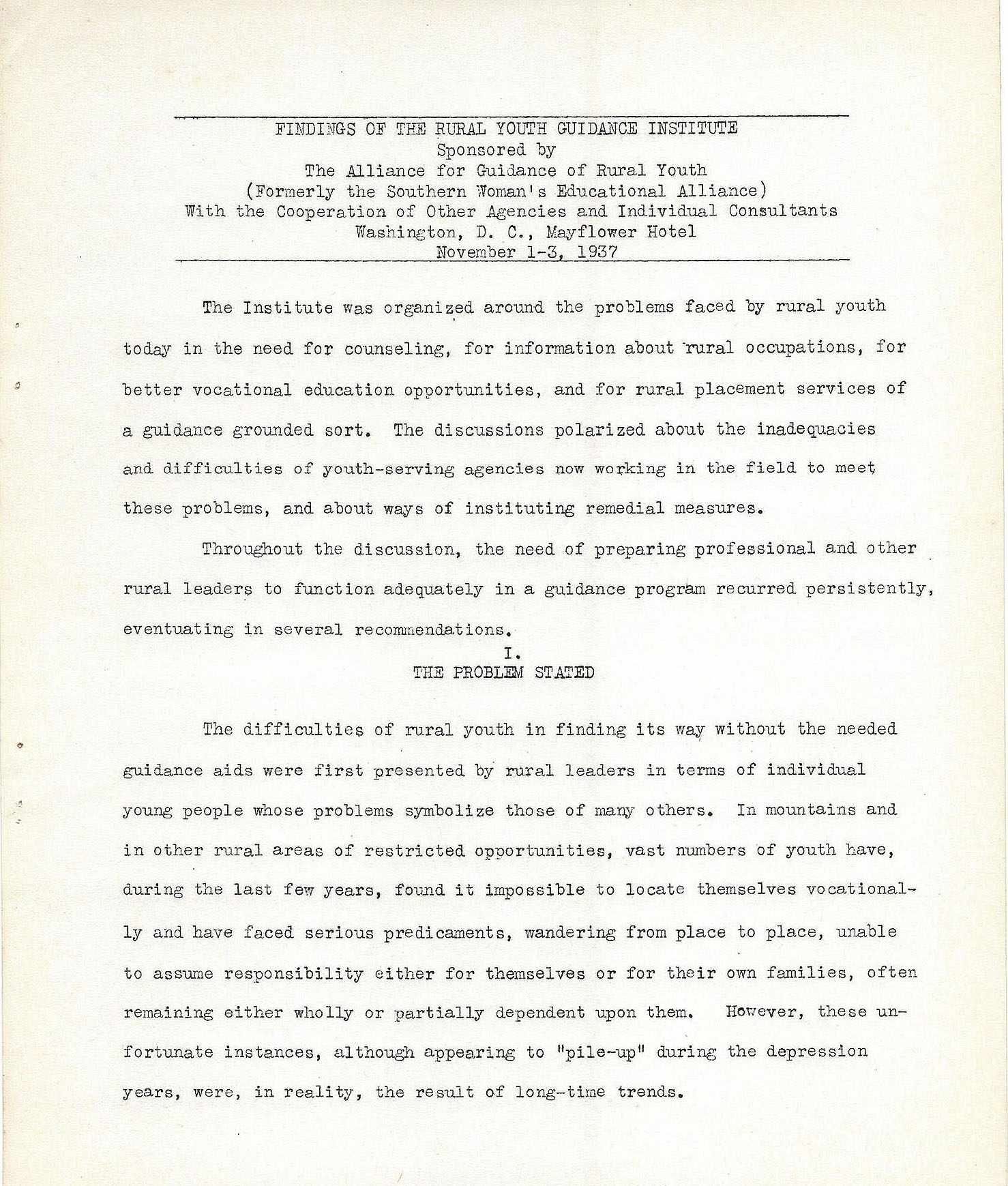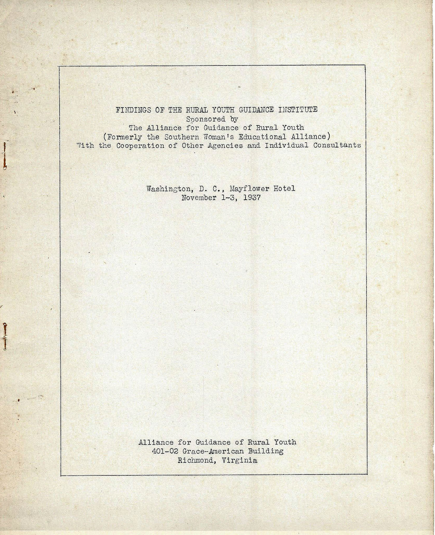 The cover of the 1937 RURAL YOUTH GUIDANCE INSTITUTE – FINDINGS indicates that this convention of youth leaders was sponsored by The Alliance for Guidance of Rural Youth (Formerly, The Southern Woman’s Educational Alliance) with the Cooperation of Other Agencies and Individual Consultants. It was held on November 1-3, 1937, at the Mayflower Hotel located in Washington, DC.