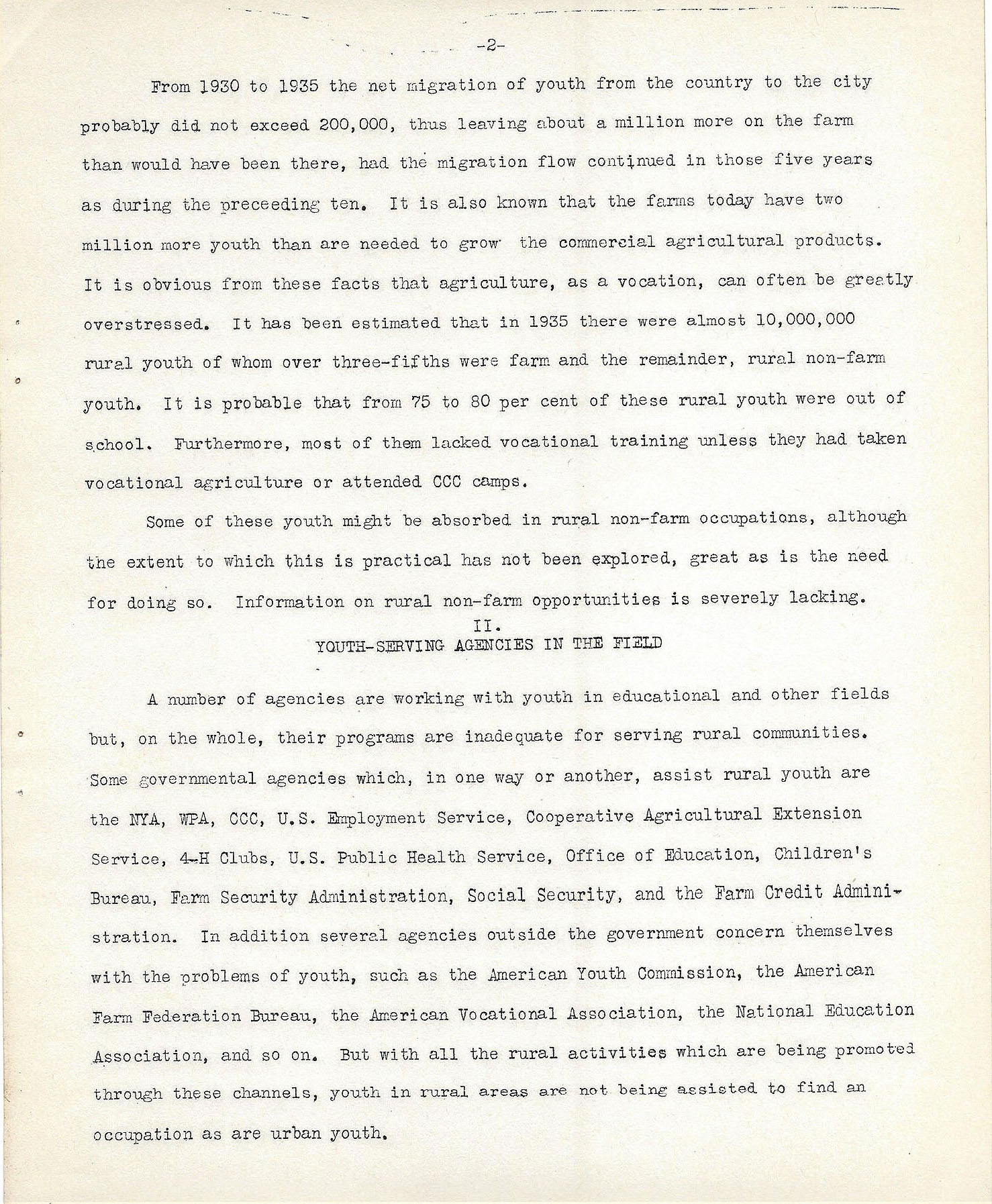 Nobody can intelligently doubt that many people, including an increasing number of old people, will continue to live in rural areas or that the maintenance and improvement of rural life [are] basic to national welfare. But in vast stretches of rural territory youth of the better sort need more incentives for staying and for improving conditions. Moreover, Secretary Wallace’s recent statement that it will not be long before three-fourths of our rural born population will be living in cities, itself climaxes other explanation as to the necessity for provision in rural areas for training in non-agricultural occupations as well as in agricultural ones.