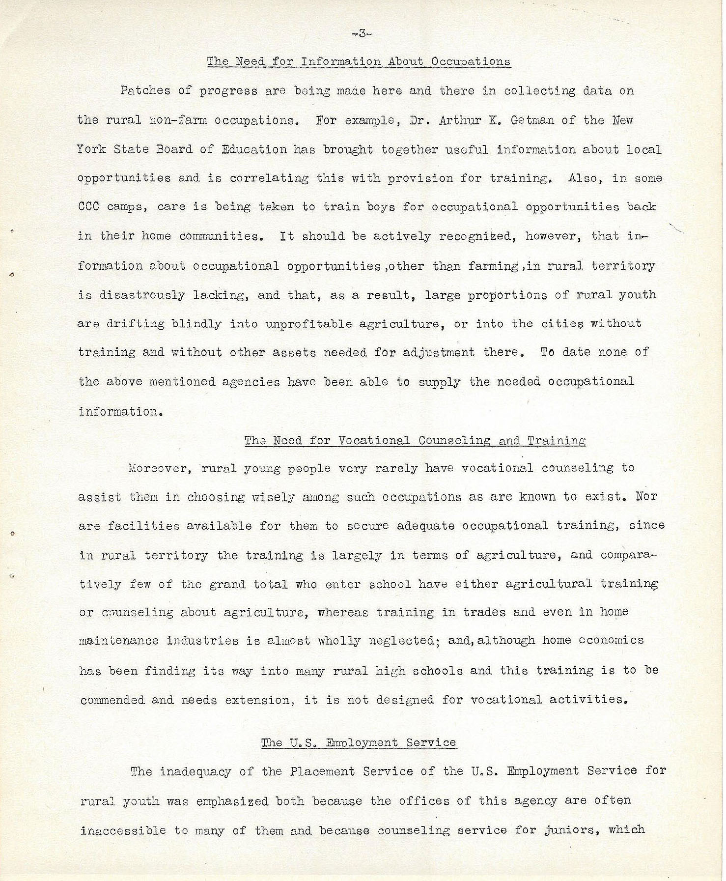 Junior Placement. The suggestion was favorably received that state employment offices, acting in cooperation with the USES [U.S. Employment Service], be asked to send properly qualified interviewers to rural county seats, to inform and counsel rural young people about both rural and urban occupations and to register and otherwise assist those ready for employment. It was suggested that the NYA and the U.S. Employment Service be asked to extend their counseling and placement services into rural areas.