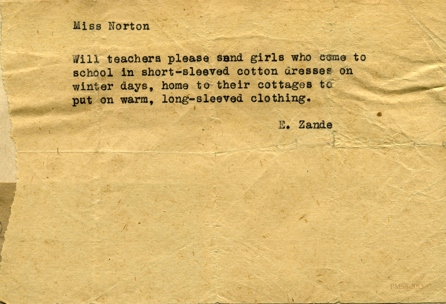 Closeup of [Ethel] Zande’s typewritten note to Miss Norton: instructions.