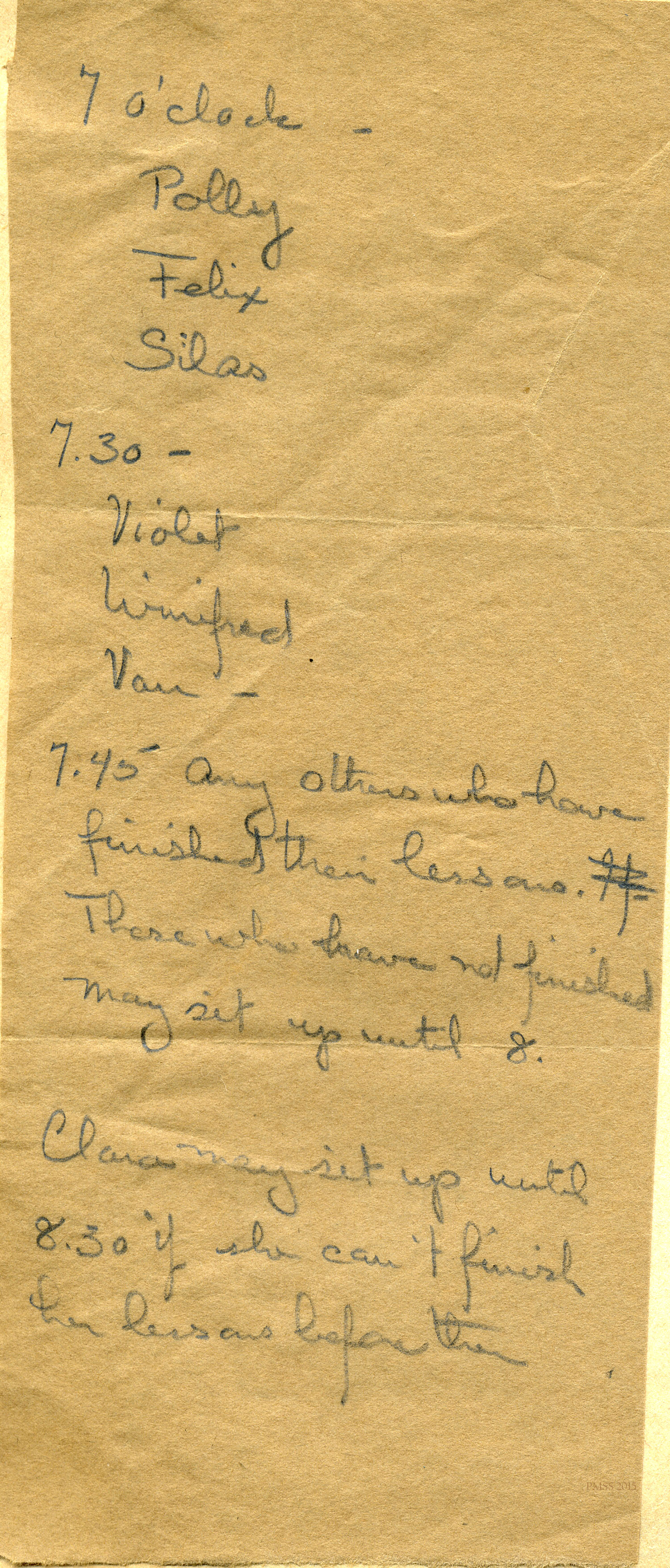 Closeup of item in [129]: Handwritten list of times, first names, classroom notes: Polly, Felix, Silas, Violet, Winifred, Van, Clara.