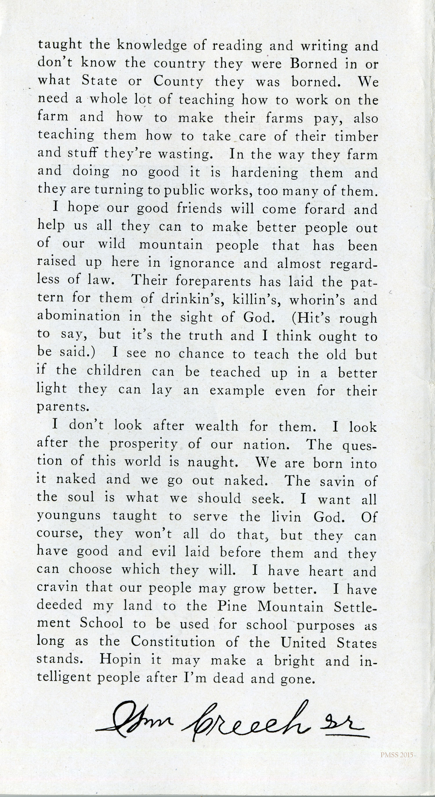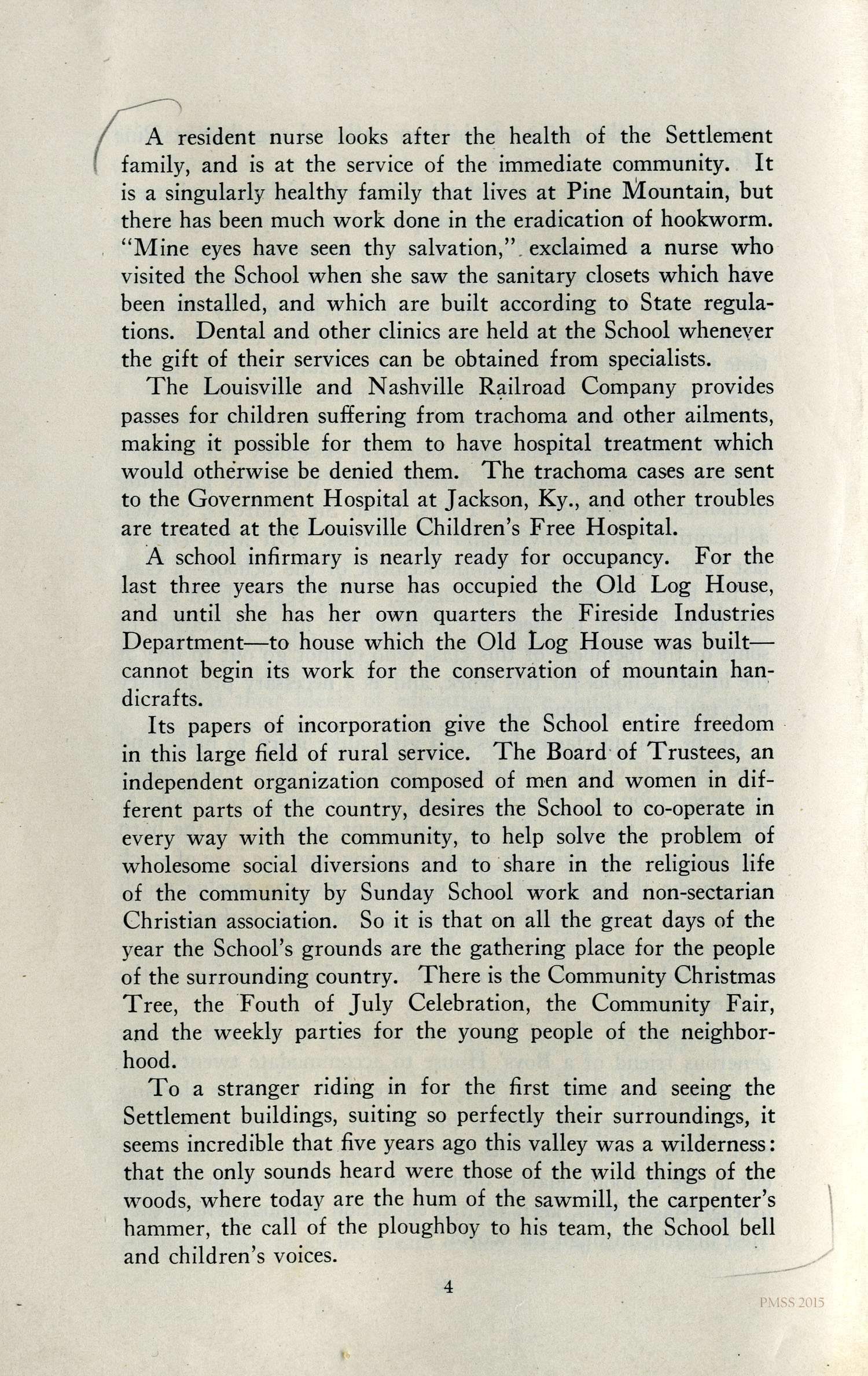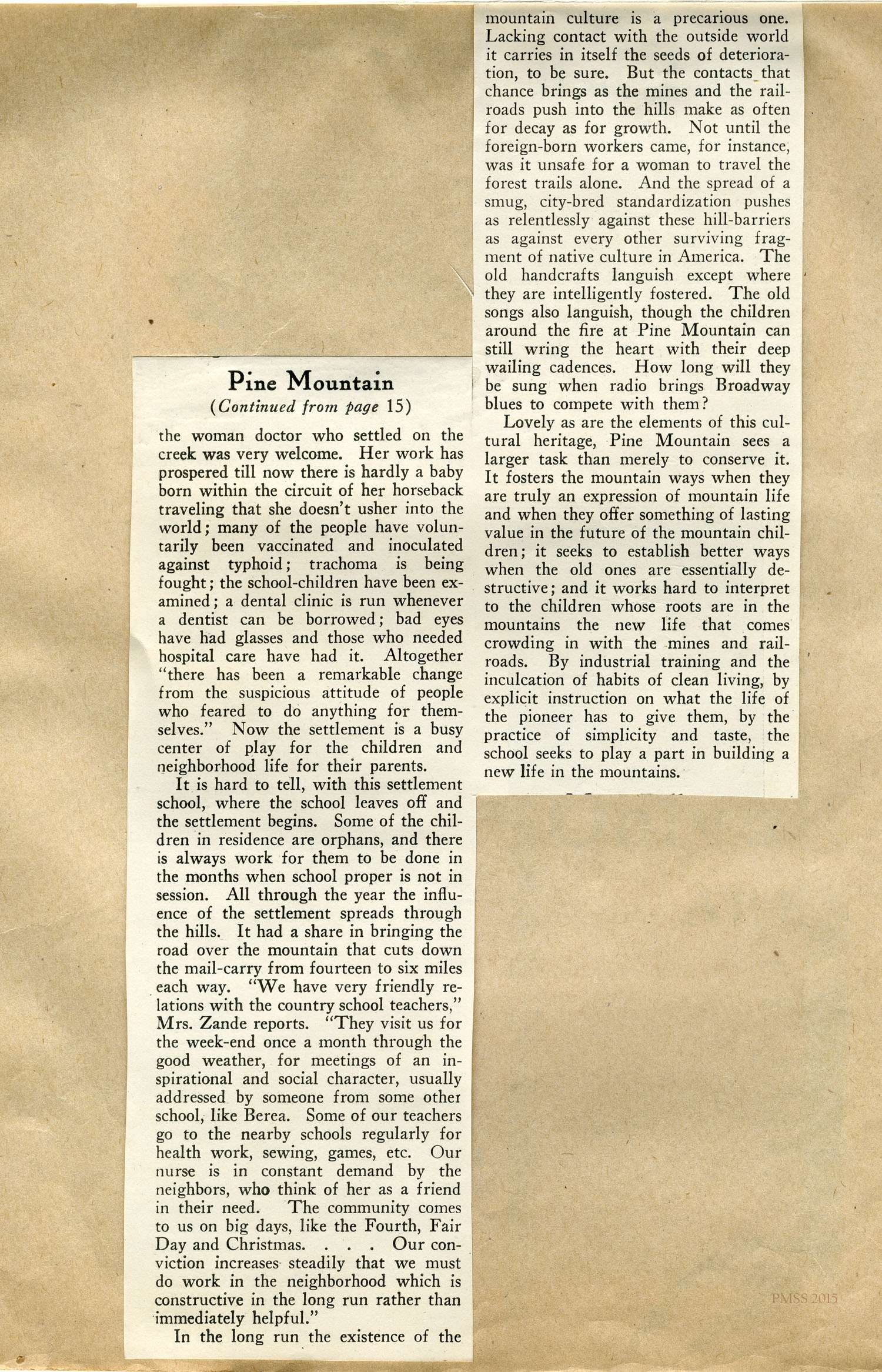 TAGS: Ethel S. Norton Scrapbook and Photograph Album (Part 4) ; Ethel S. Norton ; Ethel Zande ; students ; brochures ; PMSS history ; Big Log ; Far House ; School House ; Graduating Class 1920 ; Laurel House ; Farm House and Barn ; Sawmill ; dancing ; Boy Scouts ; spinning ; The Road ; The Doctor ; Medical Settlement ; Extension Work ; Children’s Home ; district school ; officers ; purposes ; scholarships ; visitor information ; W.F.P.S. ; Dear friend letter ; Fair Annie ; Shepherd family ; clippings ; The Woman Citizen ; Geddes Smith ; Uncle William Creech ; community ; Margaret P. Humes ; pledge cards ; photographs ; coal mines ; Uncle Fiddler John Lewis ; Aunt Louisa Lewis ; railroad connections ; maps ; General Advisory Board ; contribution card ; Limestone Branch ; cabbages ; Chapel ; cooking class ; Uncle William’s Reasons ; Resident Executive Committee ; Board of Trustees ;