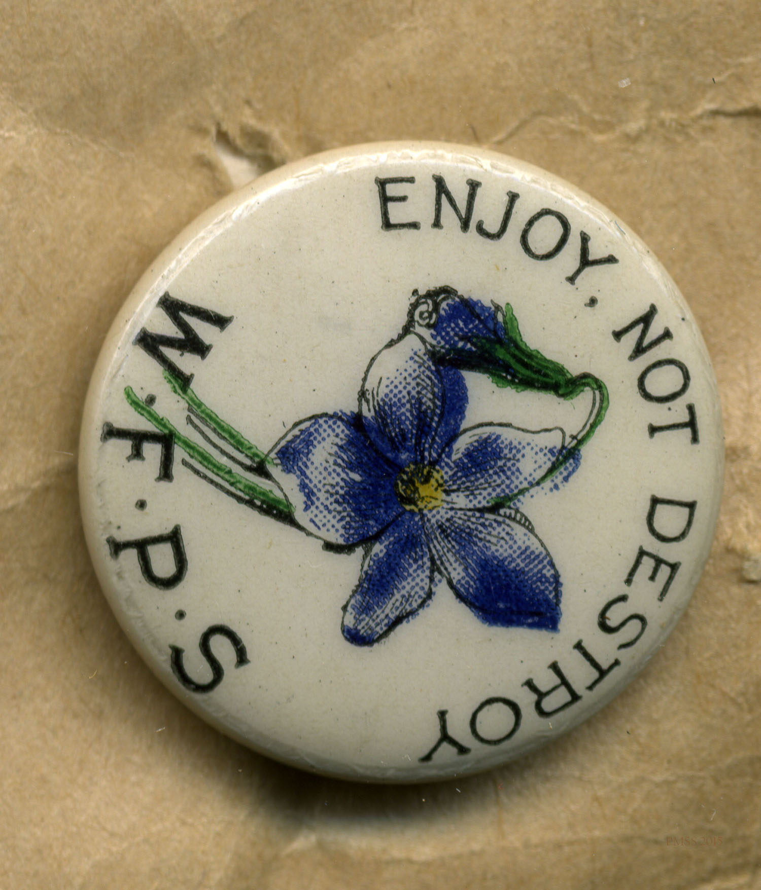 Closeup of W.F.P.S. pin: “Enjoy Not Destroy – W.F.P.S.”