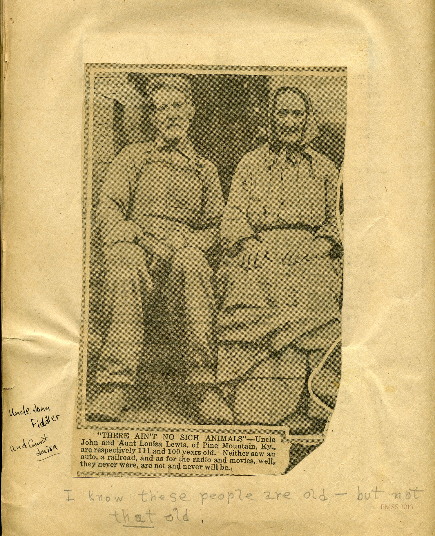 Newspaper clipping, “There Ain’t No Such Animals” with photo of Uncle John Fiddler and Aunt Louisa Lewis.