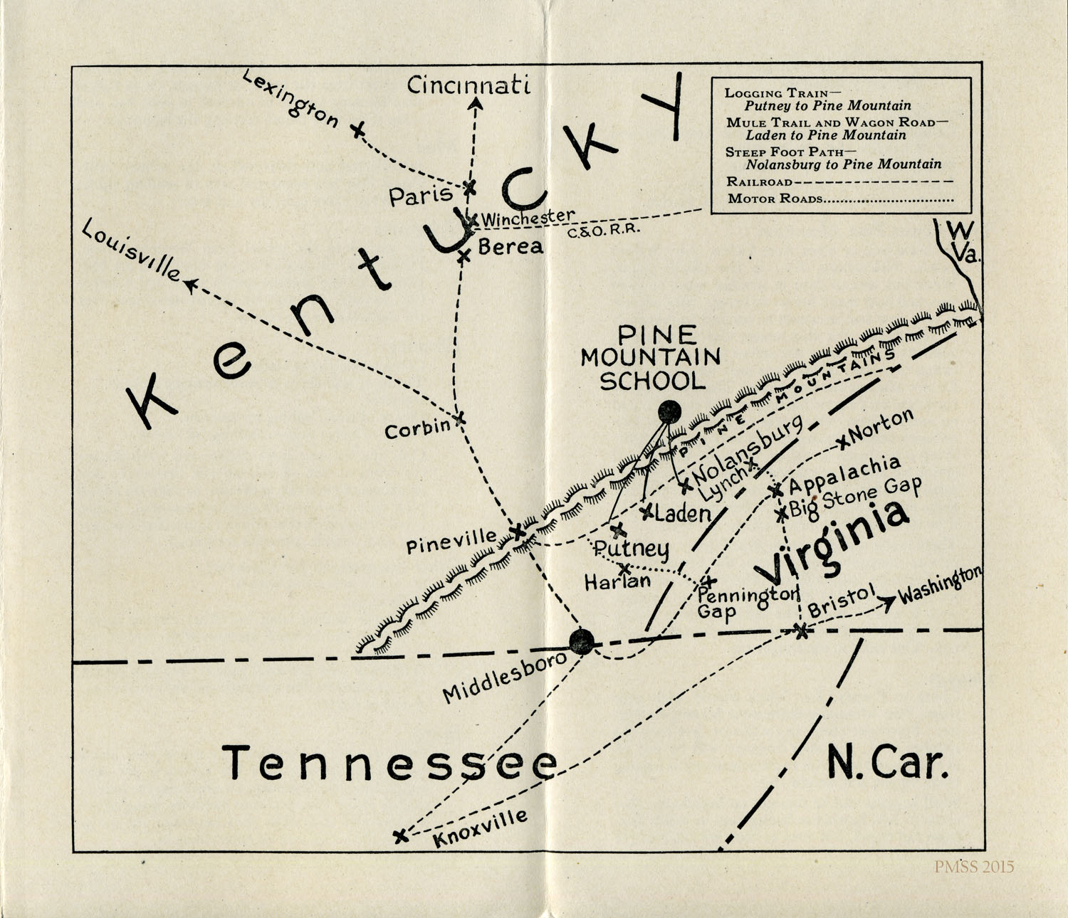 Brochure: “Information for Workers and Visitors arriving at the Pine Mountain Settlement School”: Railroad Connections; Map (of logging train, mule trail and wagon road, path, railroad, motor road),; Motor Road; Trip Across Pine Mountain; Luggage; Mail; Telegrams; Clothing; Board; General Advisory Board; Purpose; contribution card.