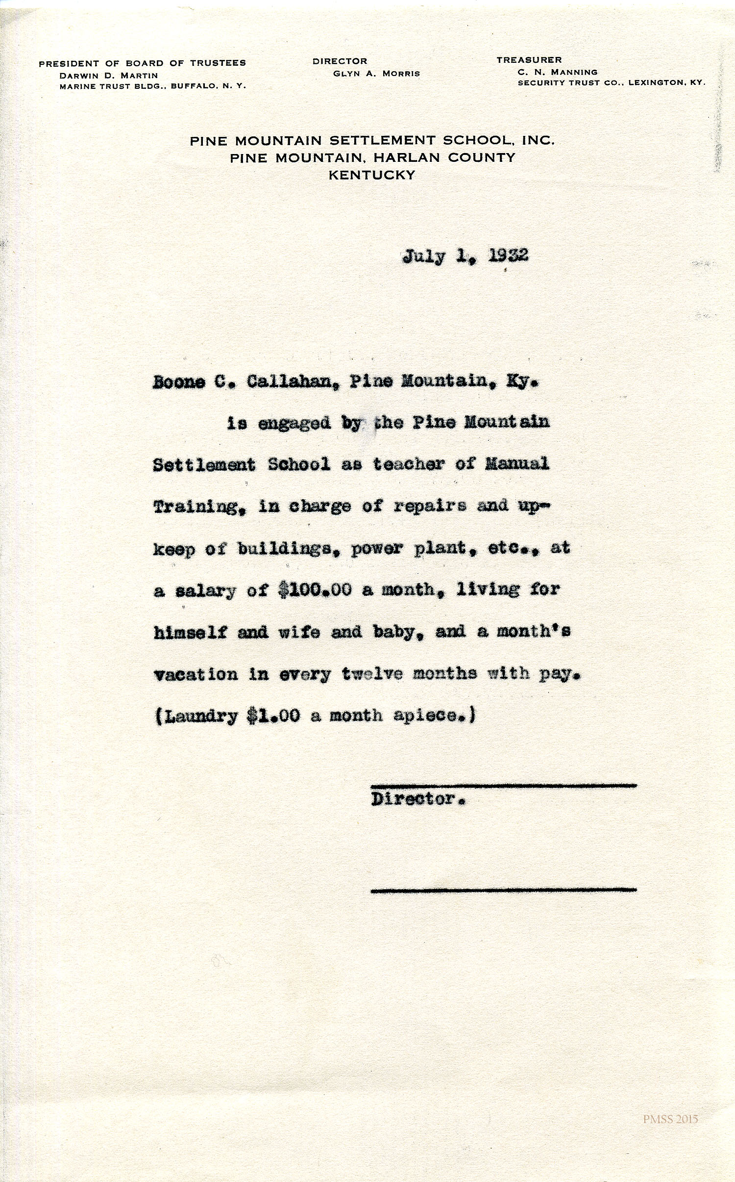 (20) July 1, 1932. Contract (on PMSS letterhead) for Boone C. Callahan, [unsigned]. Boone is engaged by PMSS “as teacher of Manual Training, in charge of repairs and upkeep of buildings, power plant, etc., at a salary of $100.00 a month, living for himself and wife and baby, and a month’s vacation in every twelve months with pay. (Laundry $1.00 a month apiece.)