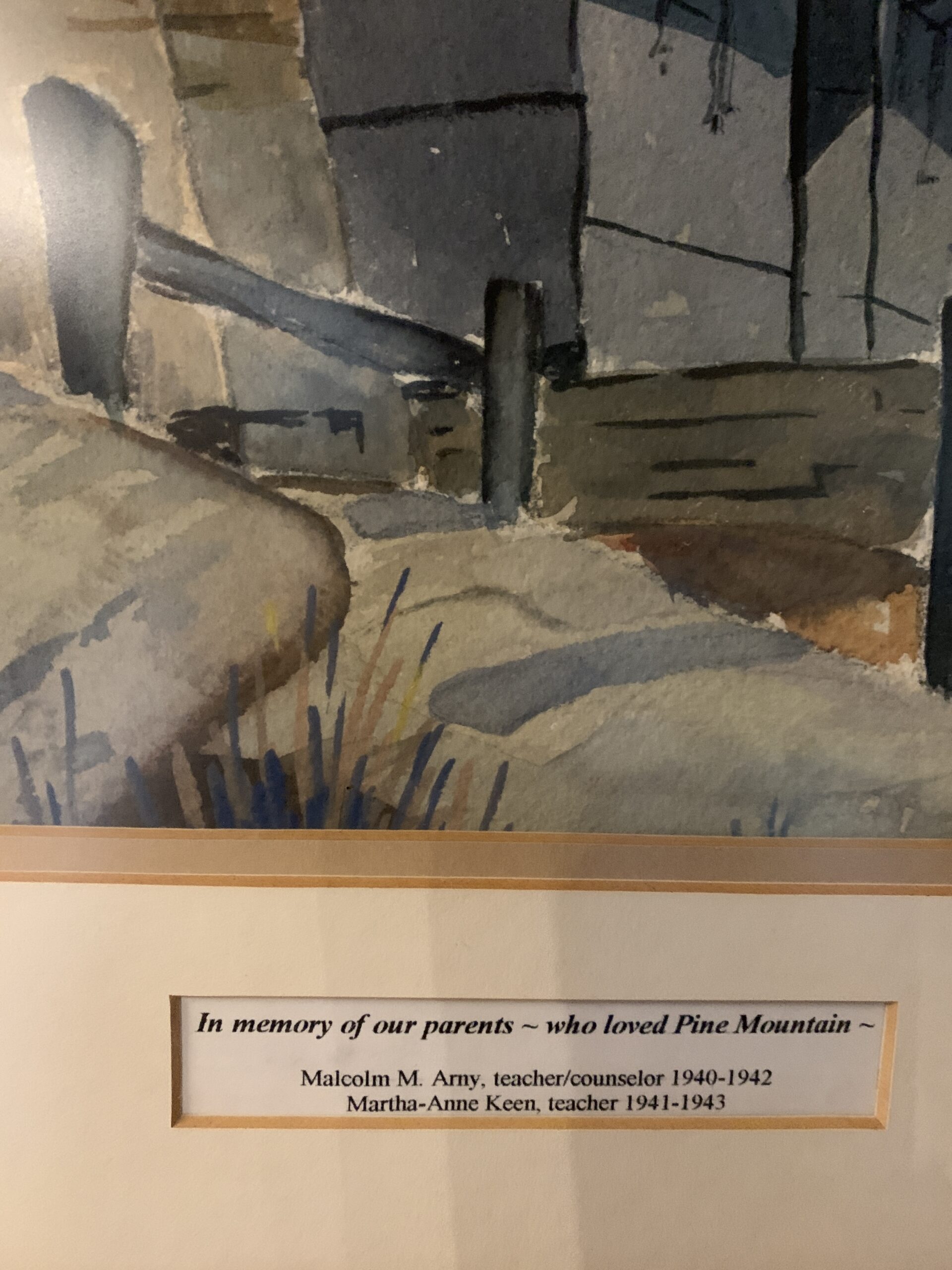 - “In memory of our parents who loved Pine Mountain” Malcolm Arny, teacherand counselor 1940-42 and Martha Anne Keene, teacher 1941-42.