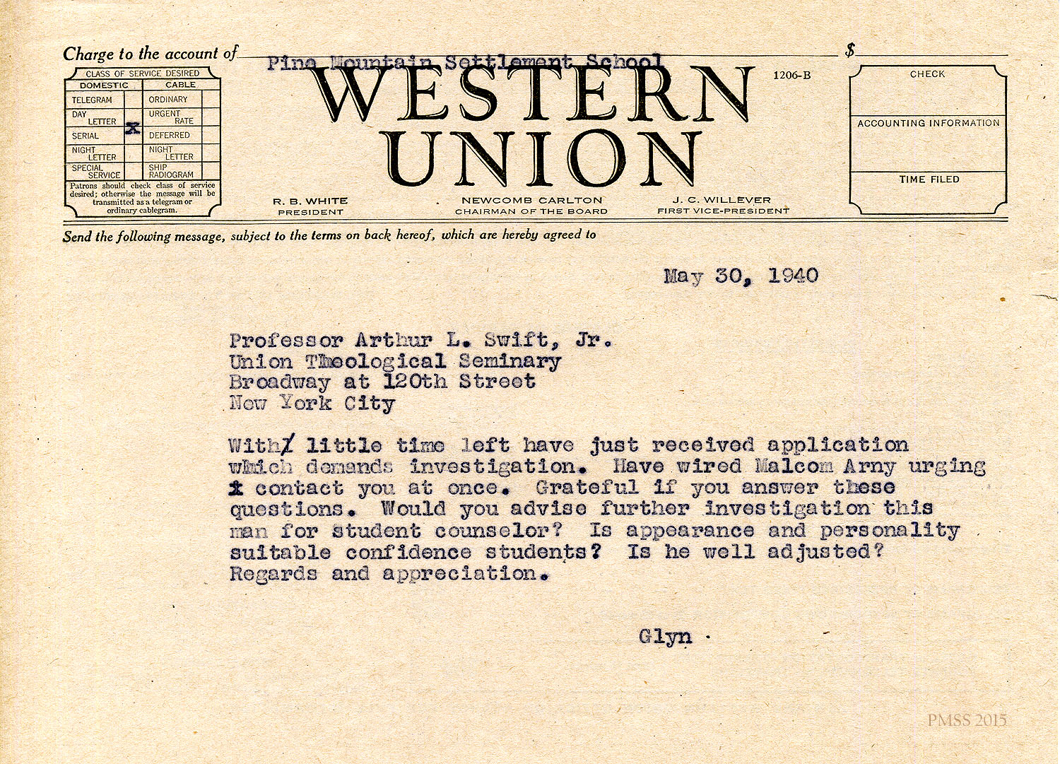 Morris via Western Union to Prof. Aurthur L. Swift, Jr. at Union Theologial Seminary, NYC: Questions about Arny’s character.
