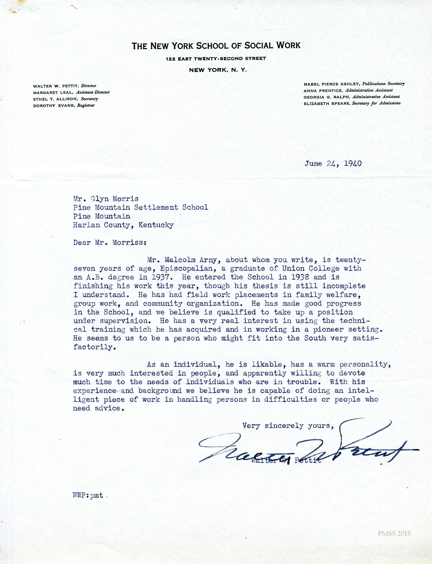 Walter W. Pettit at New York School of Social Work, NYC, to Morris: Sends completed character form and *letter of recommendation.