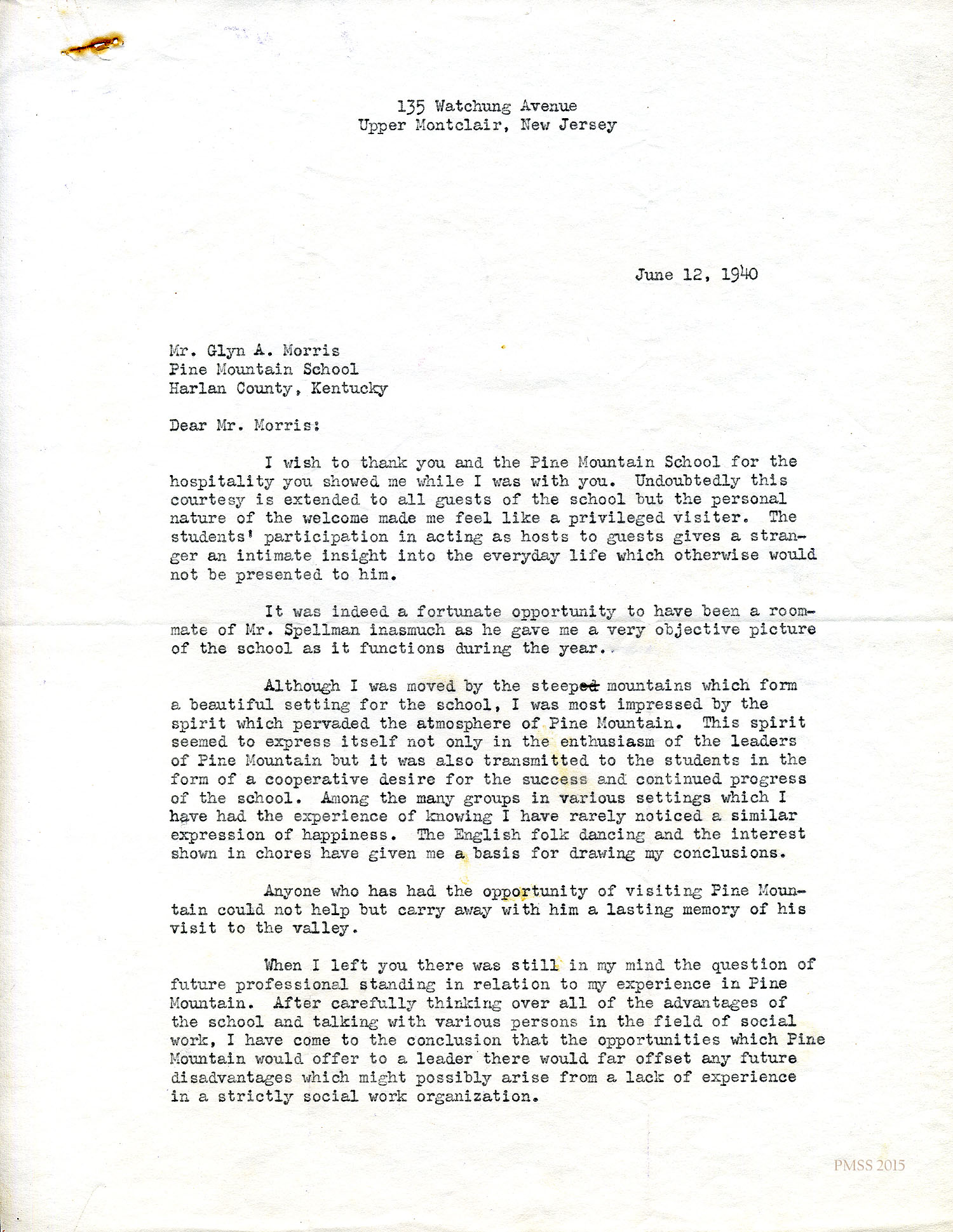 Arny in Upper Montclair, N,J to Morris: Thanks Morris for hospitality during visit; roomed with Mr. Spelman who explained the School’s operations; writes positively about the School; is interested in the position.