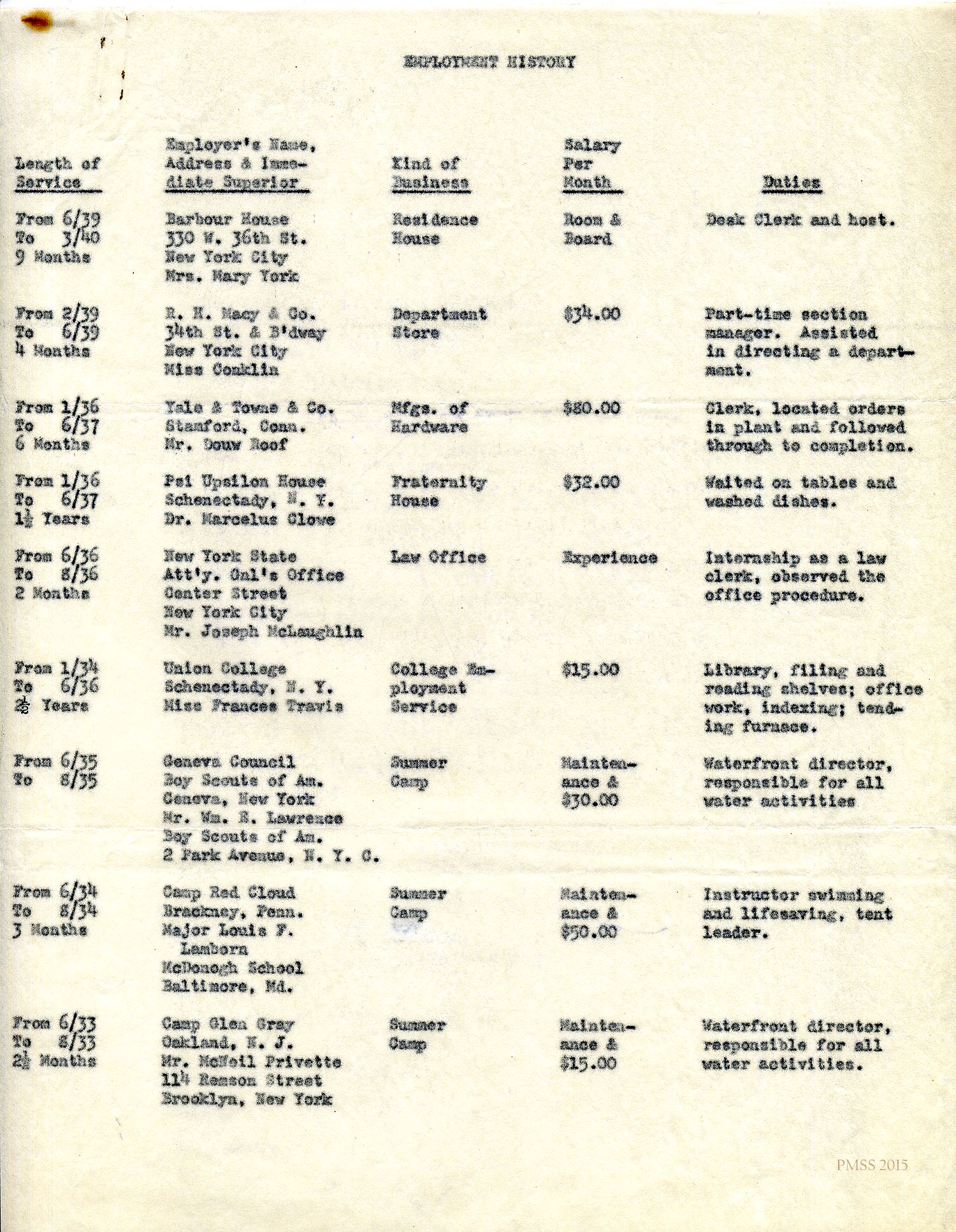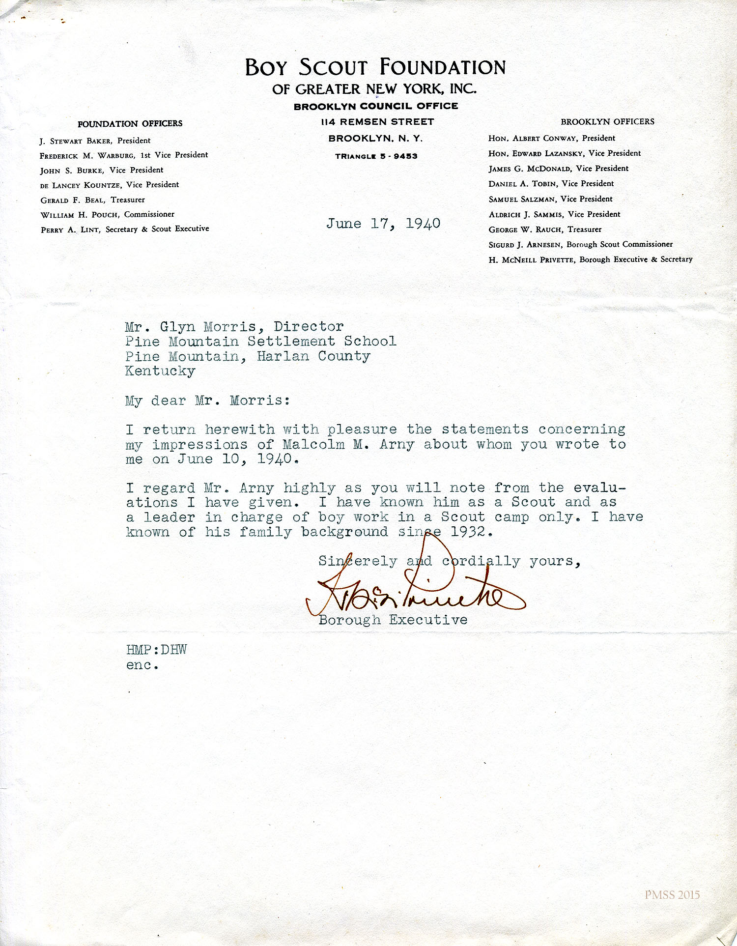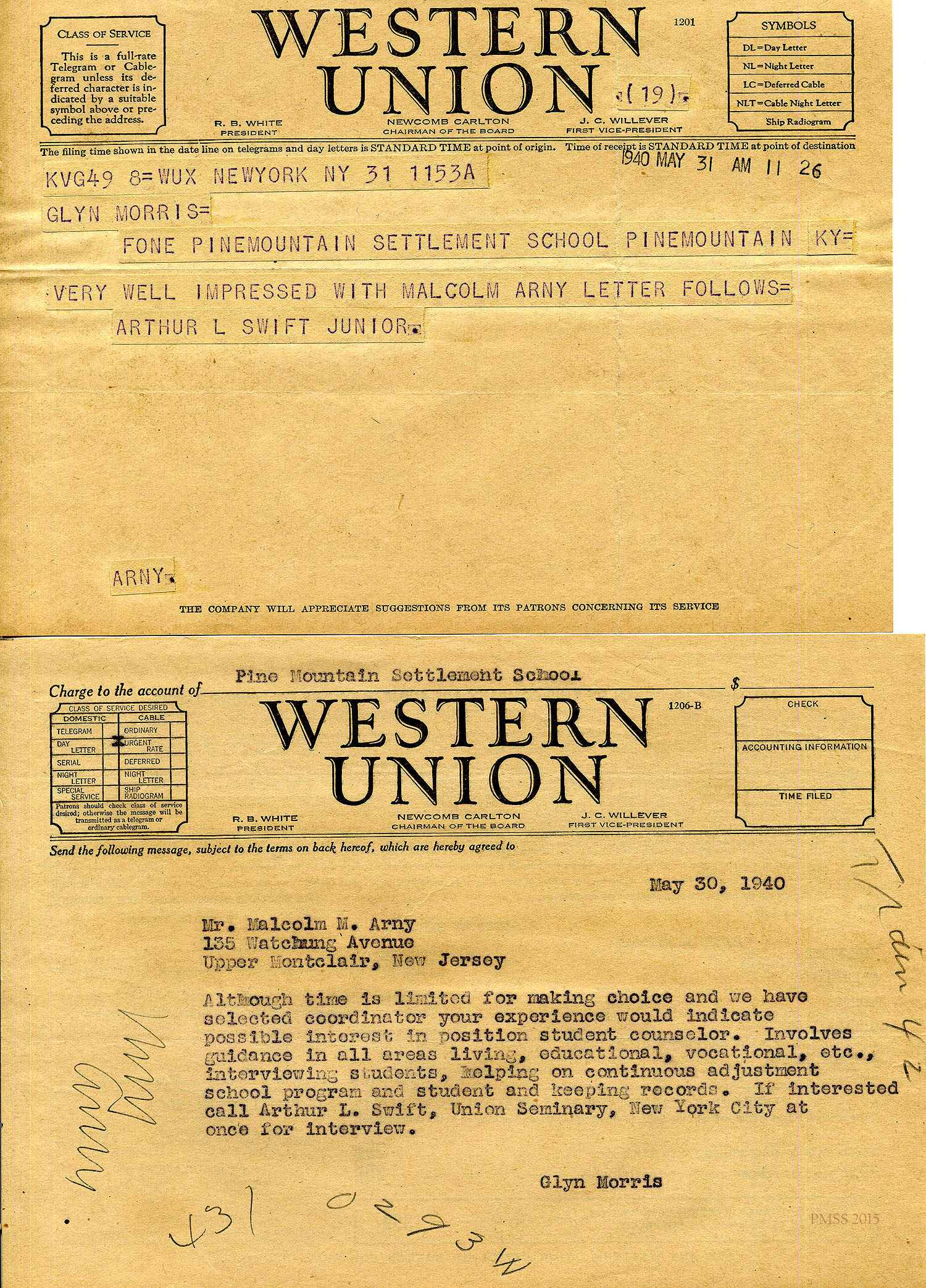Malcolm Arny in Montclair, NJ, to Glyn Morris: *Cover letter: “Mrs. McCormack of the New York School of Social Work suggested that I apply to PMSS for a position…”; interested in working with “mountain people.”; encloses completed application form and outline of personal history.