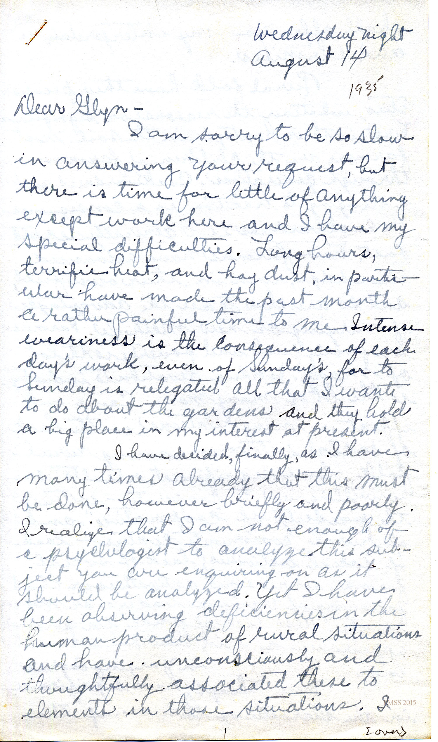 I am sorry to be so slow in answering your request, but there is time for little of anything except work here and I have my special difficulties. Long hours, terrific heat, and hay dust, in particular, have made the past month a rather painful time to me. Intense weariness is the consequence of each day’s work, even of Sundays for to Sunday is relegated all that I wanted to do about the gardens and they hold a big place in my interest at present.