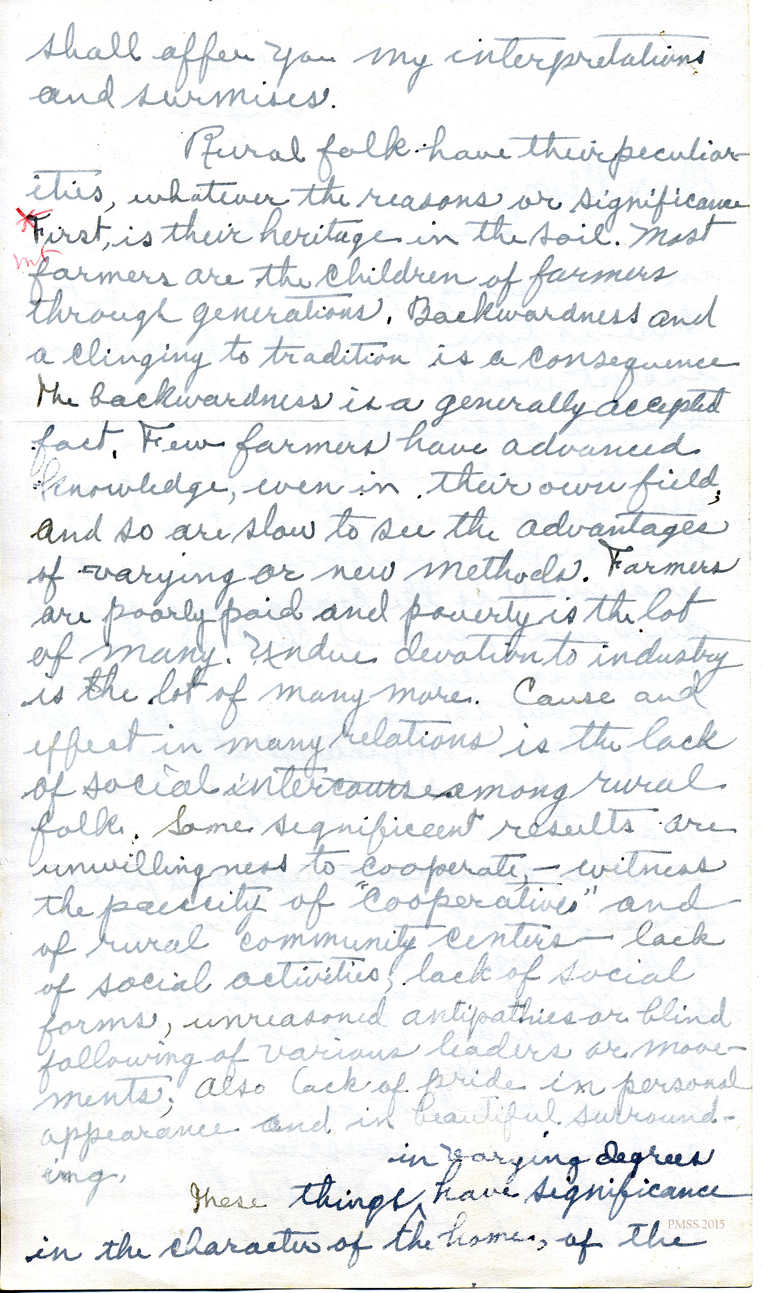 Rural folk have their peculiarities, whatever the reasons or significance. [Notation: asterisk in red] First, is their heritage in the soil. Most [Notation in red: “mt”] farmers are the children of farmers through generations. Backwardness and a clinging to tradition is a consequence. The backwardness is a generally accepted fact. Few farmers have advanced knowledge, even in their own field, and so are slow to see the advantages of varying or new methods. Farmers are poorly paid and poverty is the lot of many. Undue devotion to industry is the lot of many more. Cause and effect in many relations [are] the lack of social intercourse among rural folk. Some significant results are unwillingness to cooperate, — witness the paucity of “cooperatives” and of rural community centers — lack of social activities, lack of social forms, unreasoned antipathies or blind following of various leaders or movements, also lack of pride in personal appearance and in beautiful surrounding[s], in varying degrees.