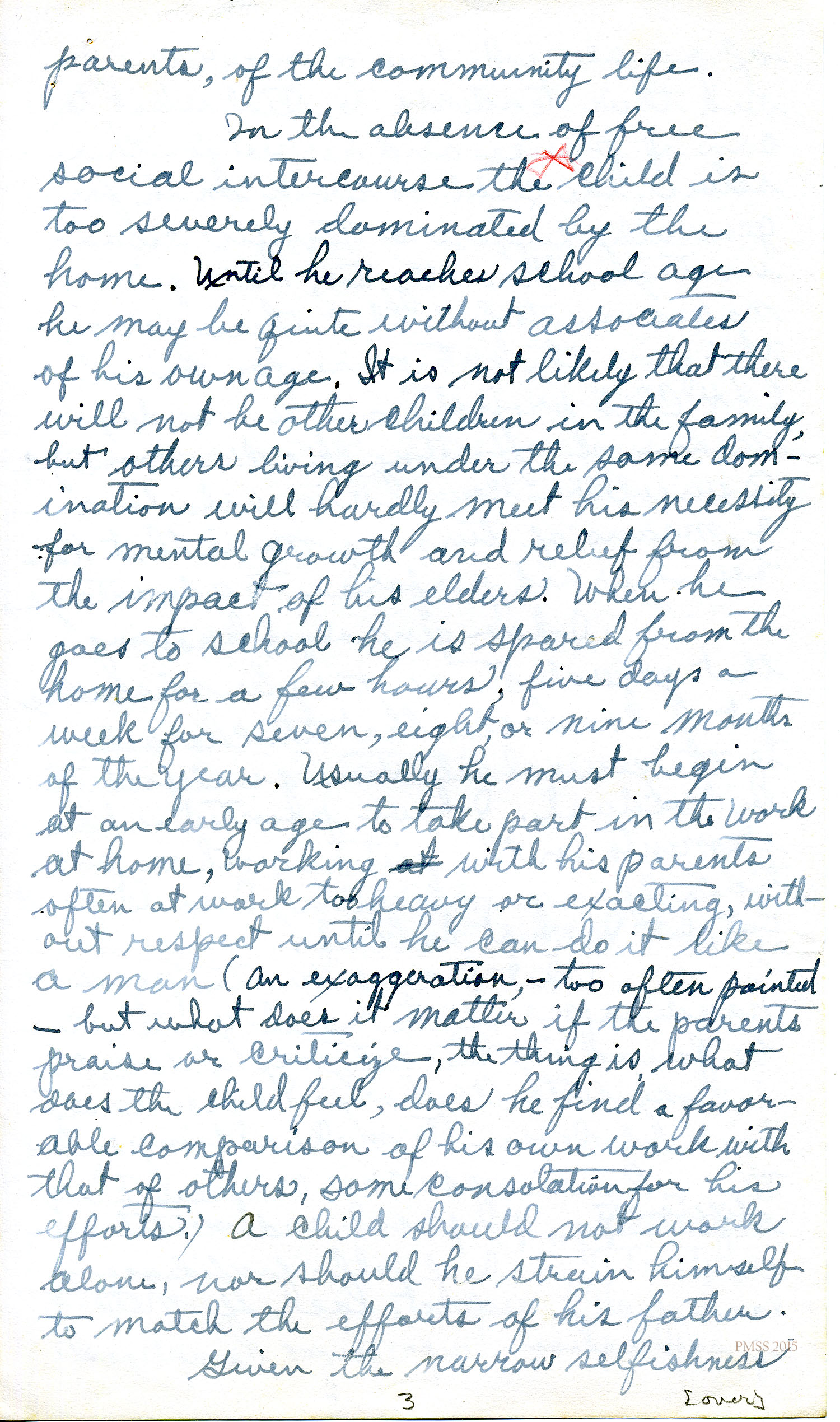 In the absence of free social intercourse the [Notation: red asterisk] child is too severely dominated by the home. Until he reaches school age he may be quite without associates of his own age. It is not likely that there will not be other children in the family, but others living under the same domination will hardly meet his necessity for mental growth and relief from the impact of his elders. When he goes to school he is spared from the home for a few hours, five days a week for seven, eight, or nine months of the year. Usually he must begin at an early age to take part in the work at home, working with his parents often at work too heavy or exacting, without respect until he can do it like a man (an exaggeration, — too often painted [?] — ) but what does it matter if the parents praise or criticize, the thing is, what does the child feel, does he find a favorable comparison of his own work with that of others, some consolation for his efforts. A child should not work alone, nor should he strain himself to match the efforts of his father.