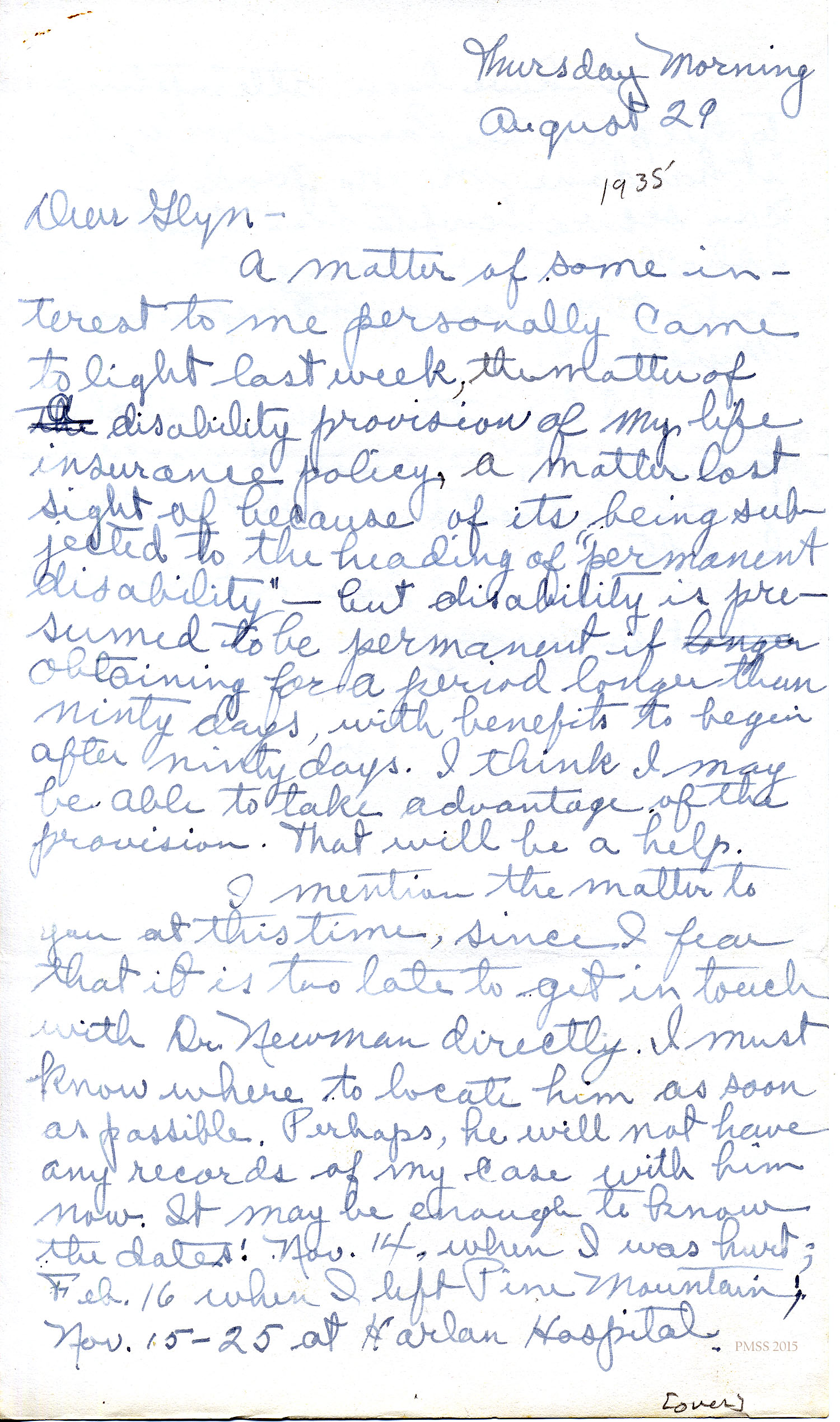 I mention the matter to you at this time, since I fear that it is too late to get in touch with Dr. Newman directly. I must know where to locate him as soon as possible. Perhaps, he will not have any records of my case with him now. It may be enough to know the dates: Nov. 14, when I was hurt; Feb. 16 when I left Pine Mountain; Nov. 15-25 at Harlan Hospital.