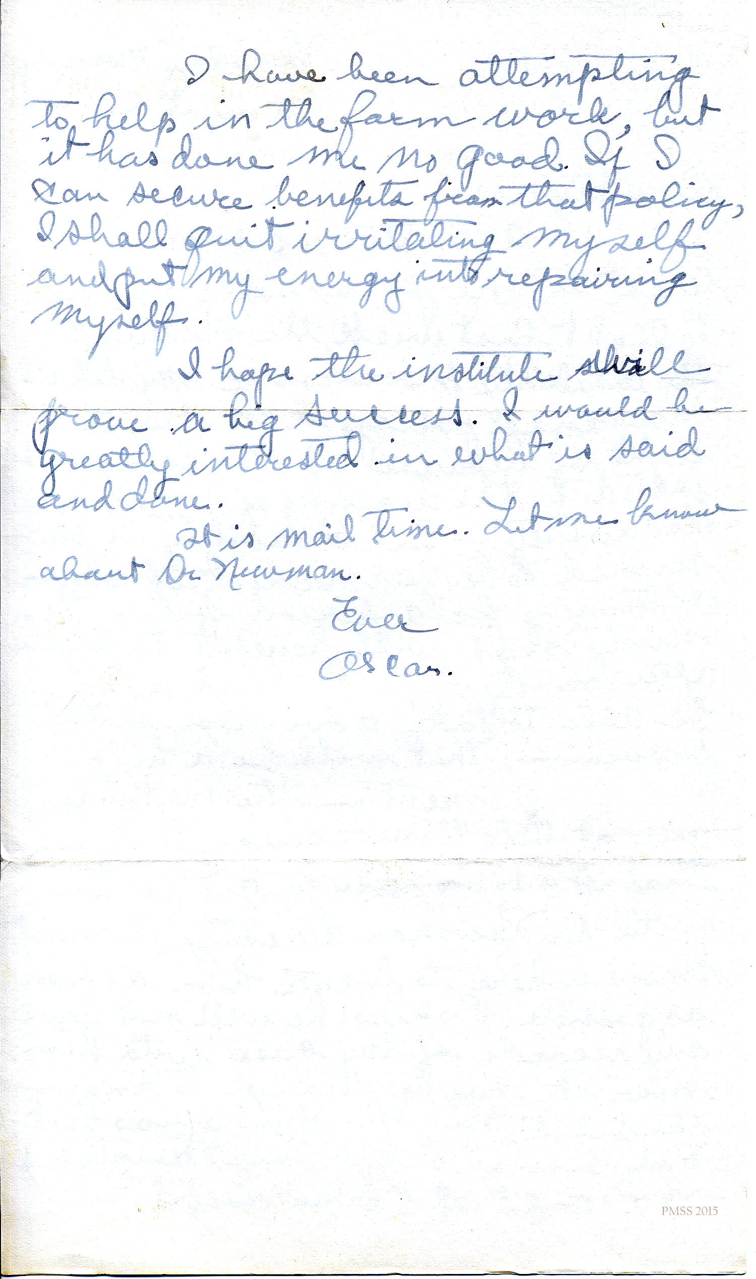 I have been attempting to help in the farm work, but it has done me no good. If I can secure benefits from that policy, I shall quit irritating myself and put my energy into repairing myself.