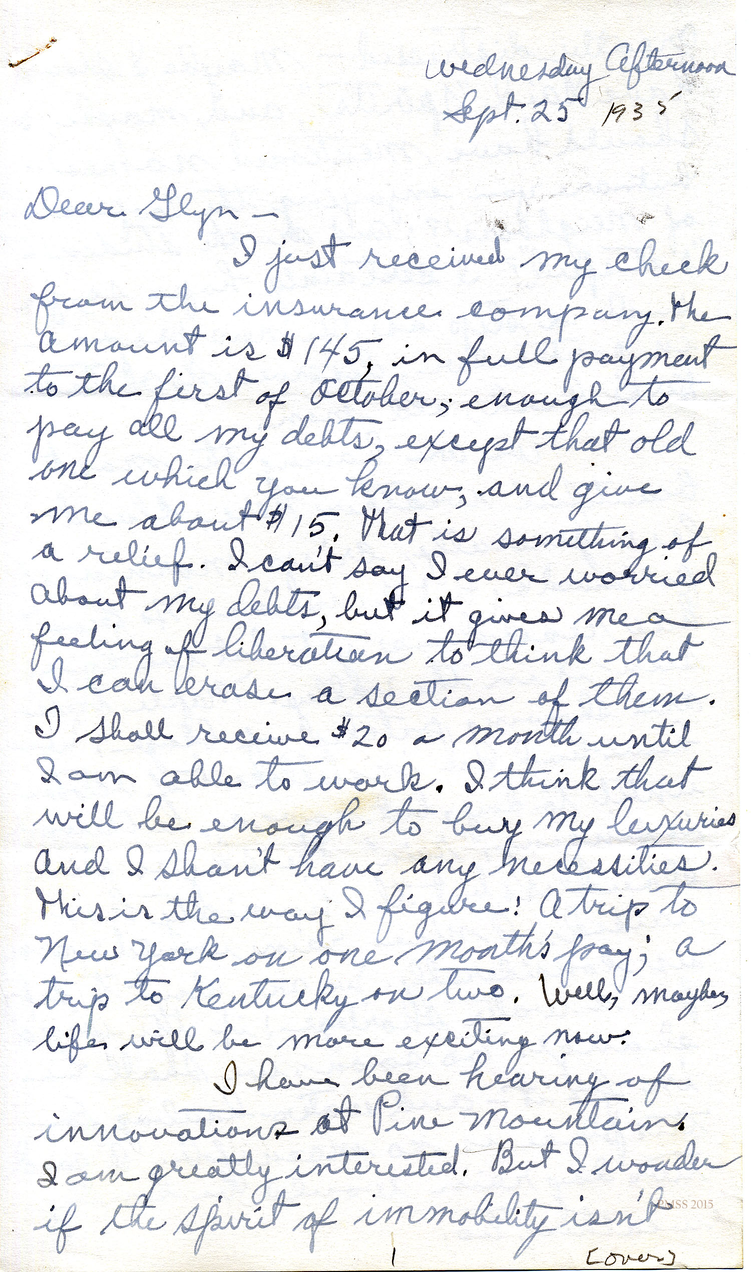 I just received my check from the insurance company. The amount is $145, in full payment to the first of October, enough to pay all my debts, except that old one which you know, and give me about $15. That is something of a relief. I can’t say I ever worried about my debts, but it gives me a feeling of liberation to think that I can erase a section of them.