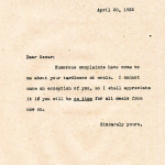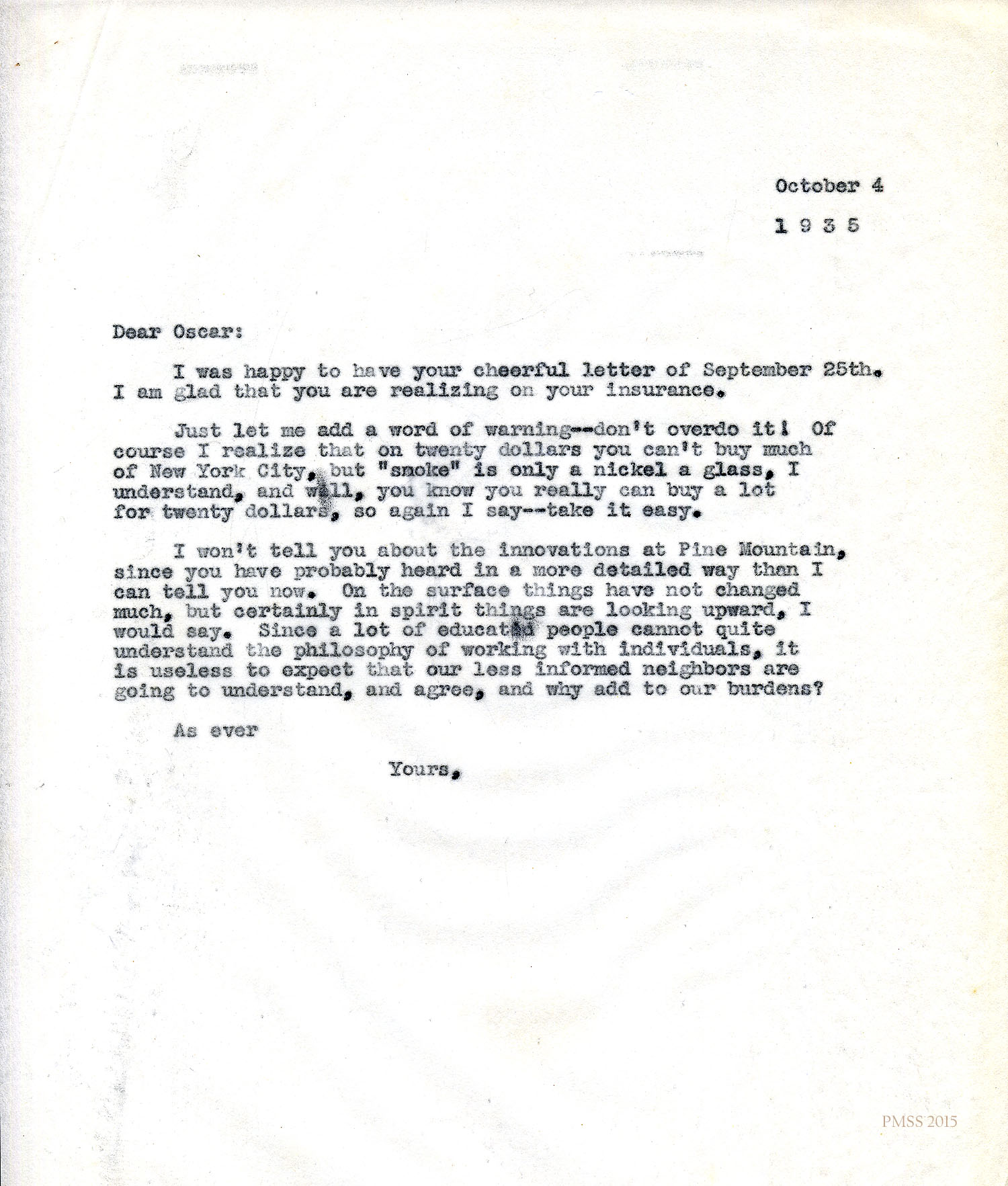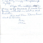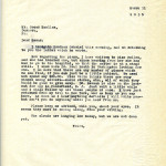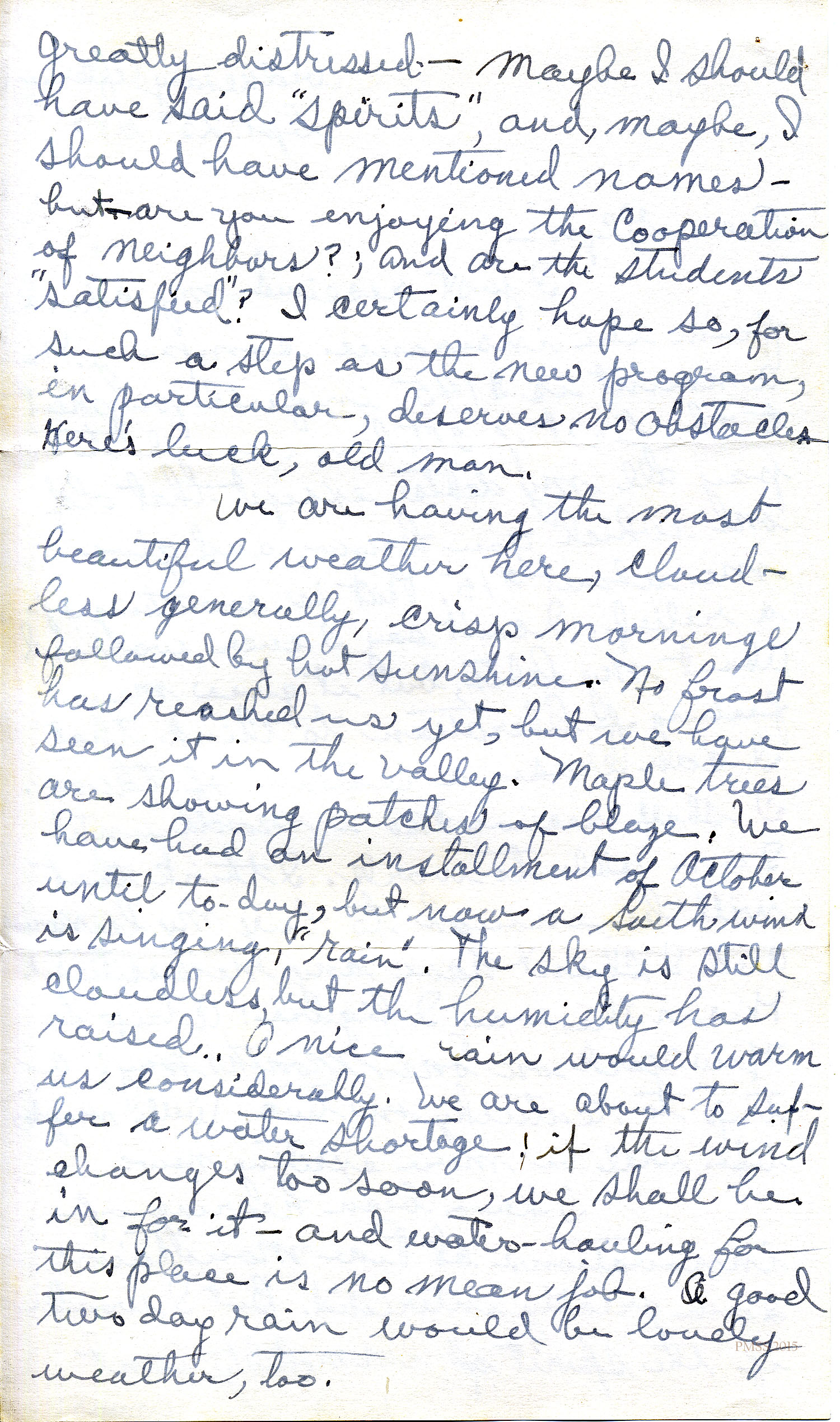 …greatly distressed — maybe I should have said “spirits,” and, maybe, I should have mentioned names — but are you enjoying the cooperation of neighbors?; and are the students “satisfied?” I certainly hope so, for such a step as the new program, in particular, deserves no obstacles. Here’s luck, old man.