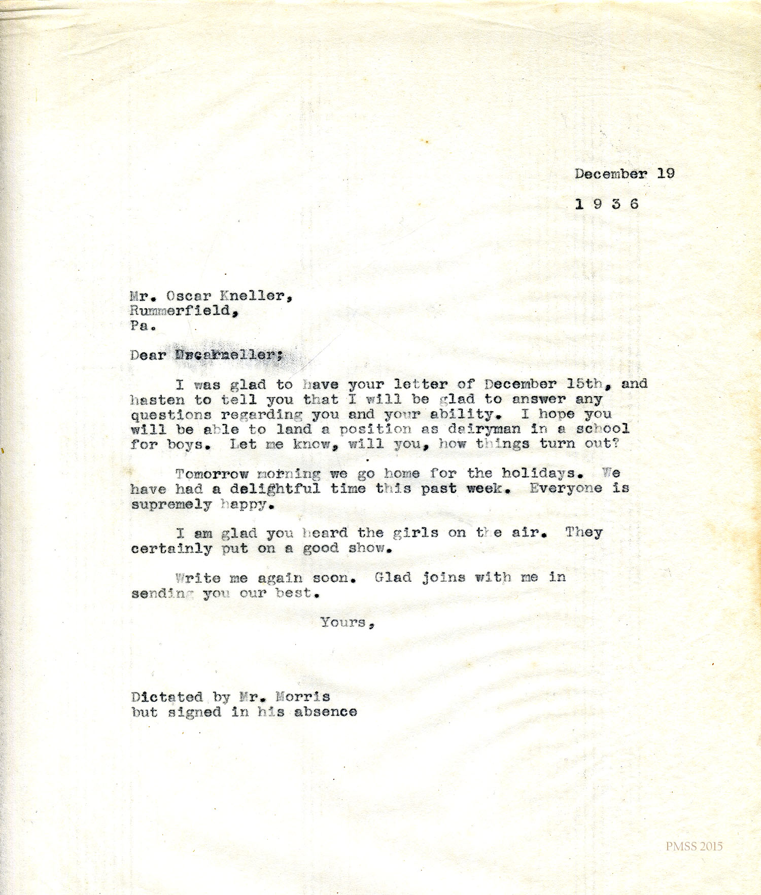 Kneller worked as dairyman, farmer and teacher of agriculture at PMSS from 1931 to 1934. His time at the School was cut short due to a dynamite explosion that nearly blinded him. His letters detail his struggle to come to terms with the accident and with the resulting unemployment. As these letters indicate, Morris and Kneller exchanged advice and discussed PMSS issues. Morris came to Kneller’s assistance in several instances, particularly with a plea to postpone an outstanding debt and in helping him to find another job.