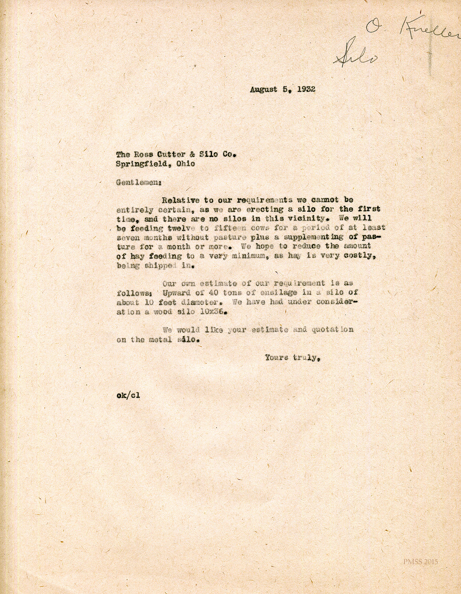 Relative to our requirements we cannot be entirely certain, as we are erecting a silo for the first time, and there are no silos in this vicinity. We will be feeding twelve to fifteen cows for a period of at least seven months without pasture plus a supplementing of pasture for a month or more. We hope to reduce the amount of hay feeding to a very minimum, as hay is very costly, being shipped in.