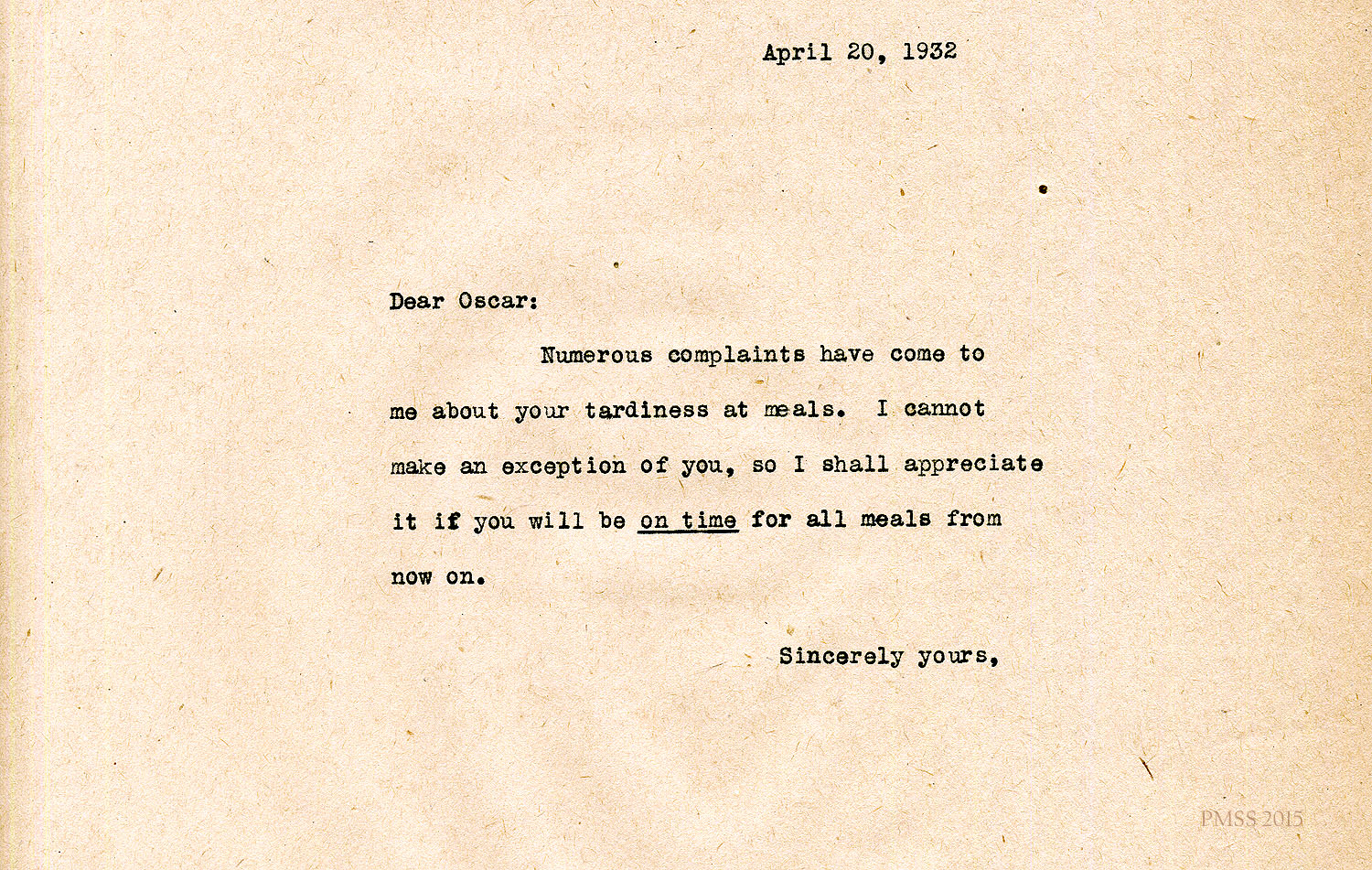 Numerous complaints have come to me about your tardiness at meals. I cannot make an exception of you, so I shall appreciate it if you will be on time (underlined) for all meals from now on.