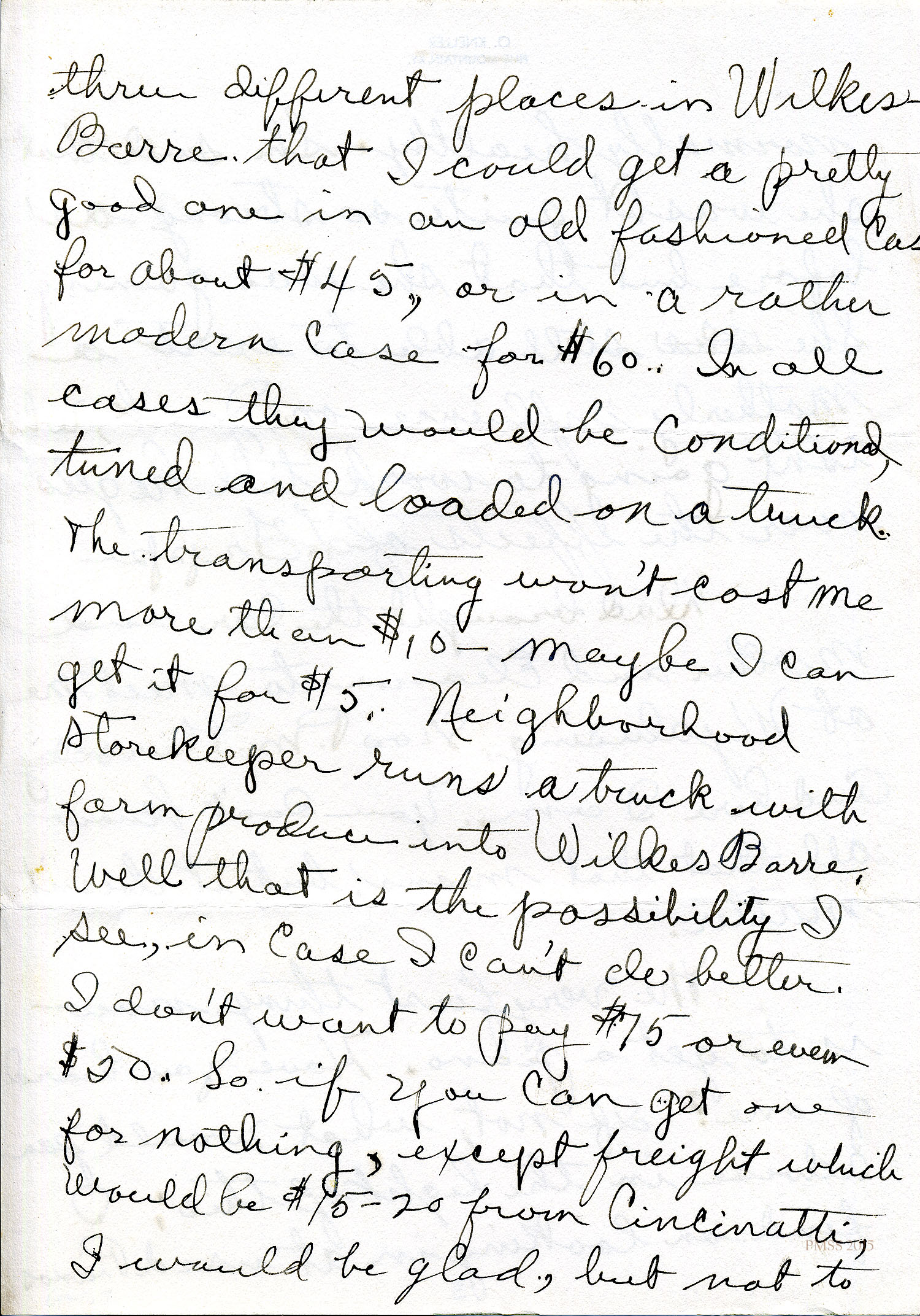 …thru different places in Wilkes-Barre that I could get a pretty good one in an old fashioned case for about $45, or in a rather modern case for $60. In all cases they would be conditioned, tuned and loaded on a truck. The transporting won’t cost me more than $10 — maybe I can get it for $5. Neighborhood storekeeper runs a truck with farm produce into Wilkes Barre.