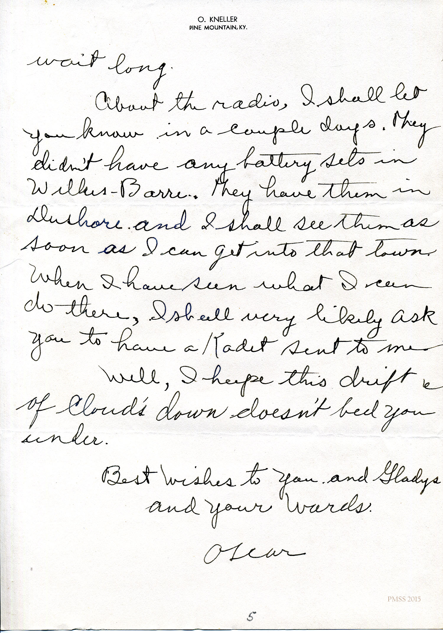 About the radio, I shall let you know in a couple days. They didn’t have any battery sets in Wilkes-Barre. They have them in Dushore and I shall see them as soon as I can get into that town. When I have seen what I can do there, I shall very likely ask you to have a Kadet sent to me.