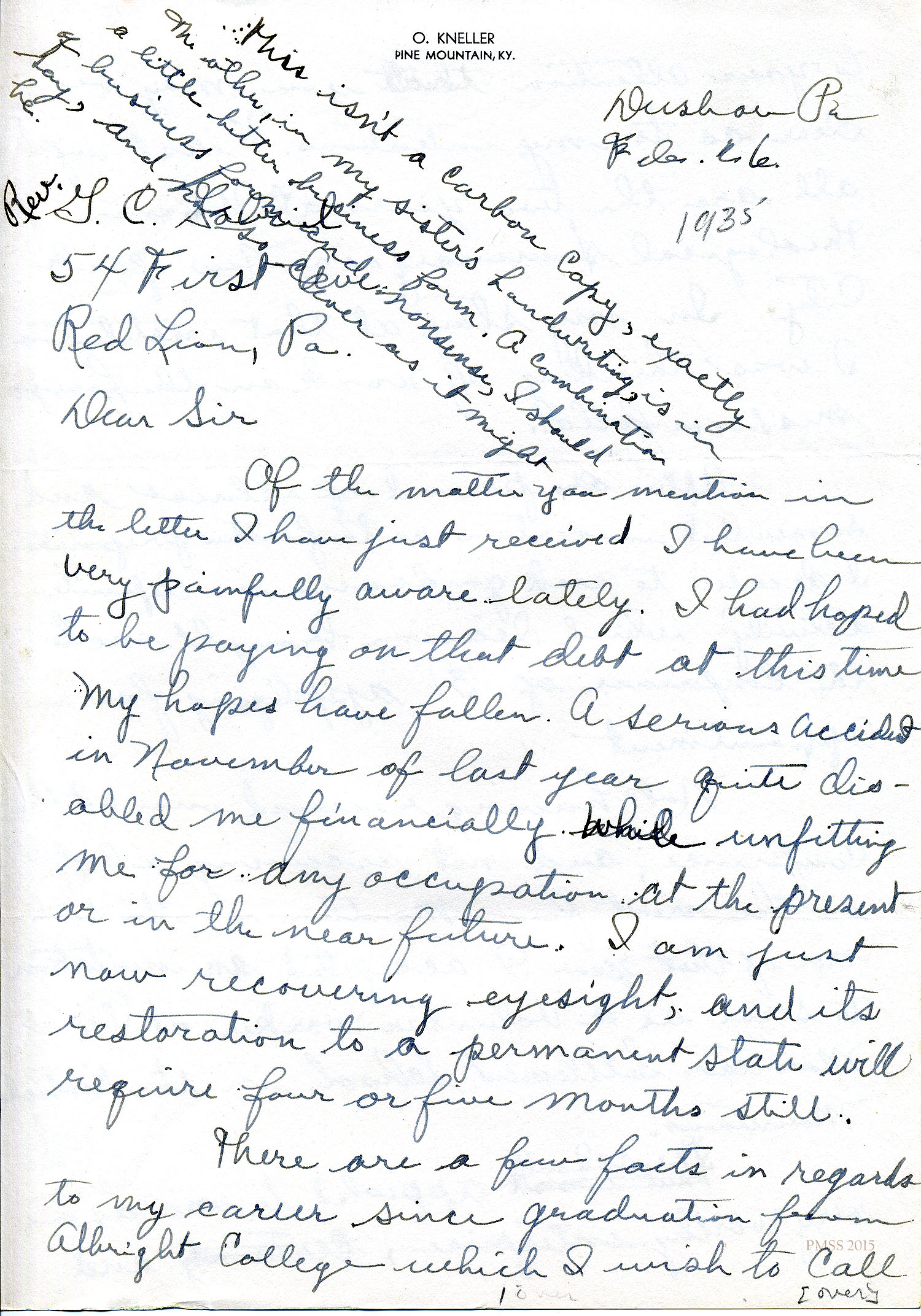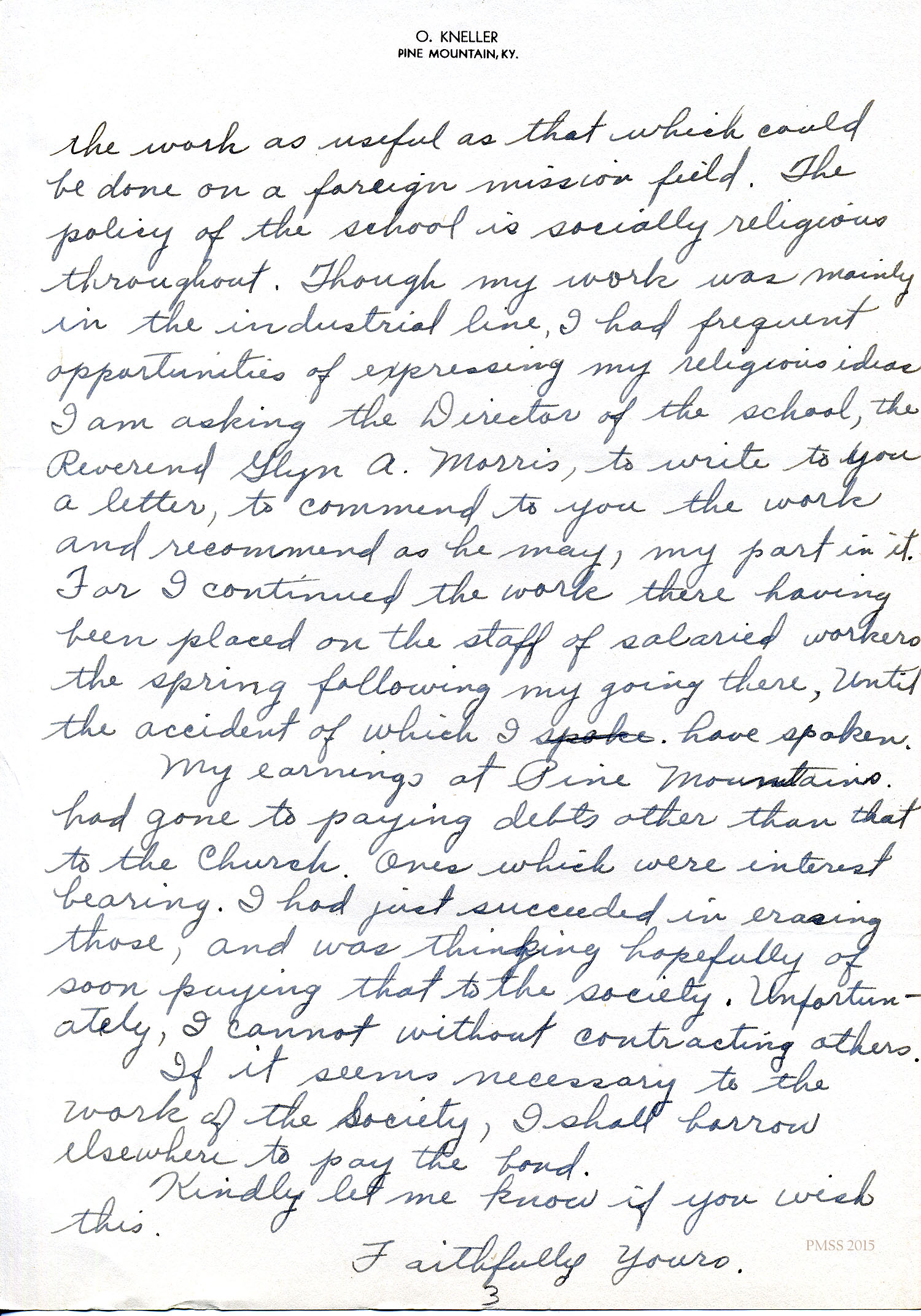 While I realize that an obligation is an obligation, I feel very strongly that the facts of this case would attenuate at least for the present, his obligation to the church. Mr. Kneller tried to secure a position with a church, if I remember rightly, some time around 1930, but because there was no vacancy he was obliged to look elsewhere. All during his student days he desired to be an agricultural missionary, so that when I took up my duties as Director of the Pine Mountain school in 1931, I sent for him at once, feeling that this was the ideal place for him to use not only his agricultural training, but his social and religious training as well. He came at once, and for a time worked on our staff as a volunteer worker. Later he became the head farmer. In passing, I might say that this school is similar to the one conducted by the Evangelical Church at Red Bird, and that while the school is not under the direct supervision of any church it is decidedly Christian in character.