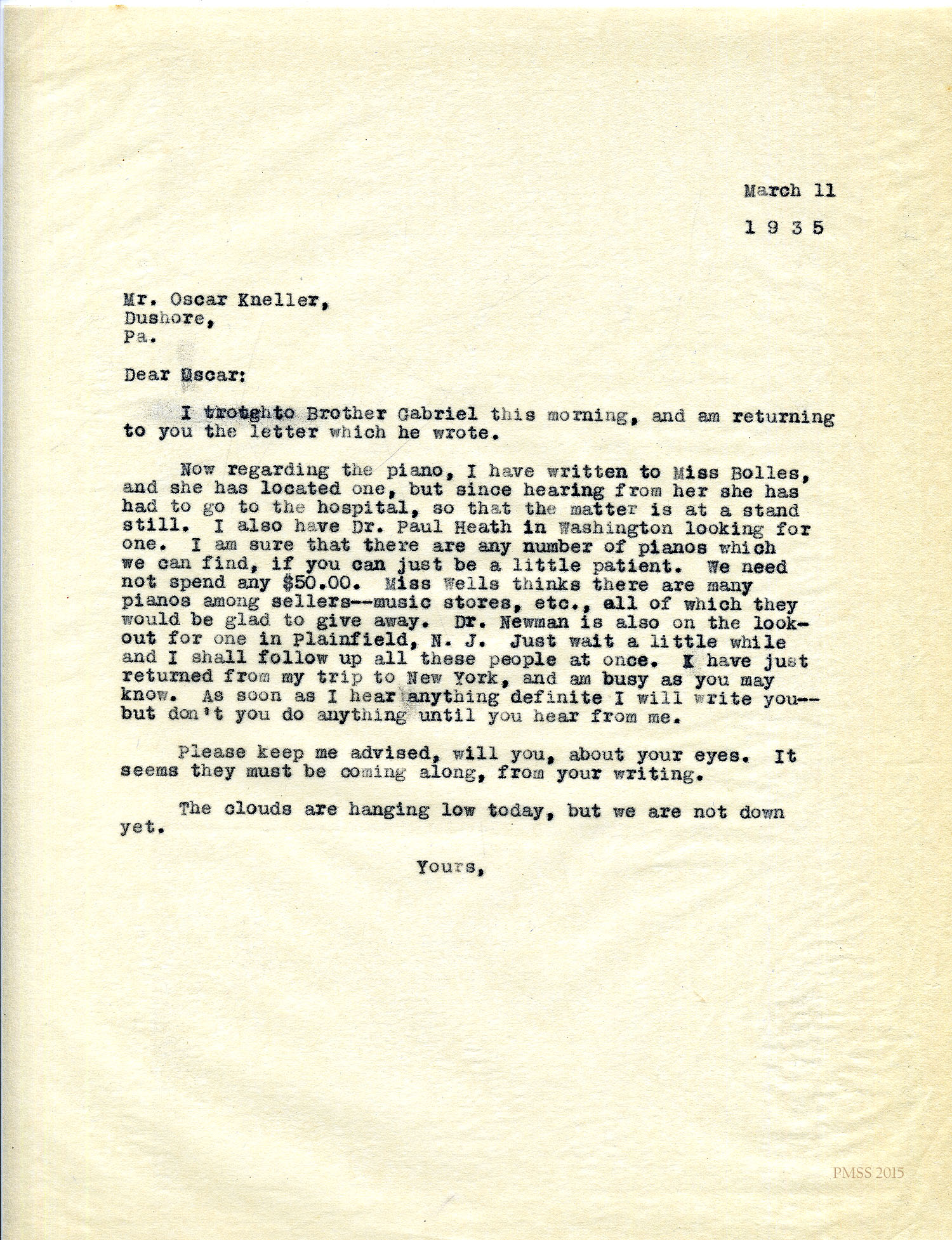 As soon as I hear something about the piano, I will write you a longer letter. Unfortunately, Miss Bolles is now in the hospital. I am still waiting to hear from Dr. Heath in Wilkes-Barre, and the Newmans are waiting to hear from Plainfield.
