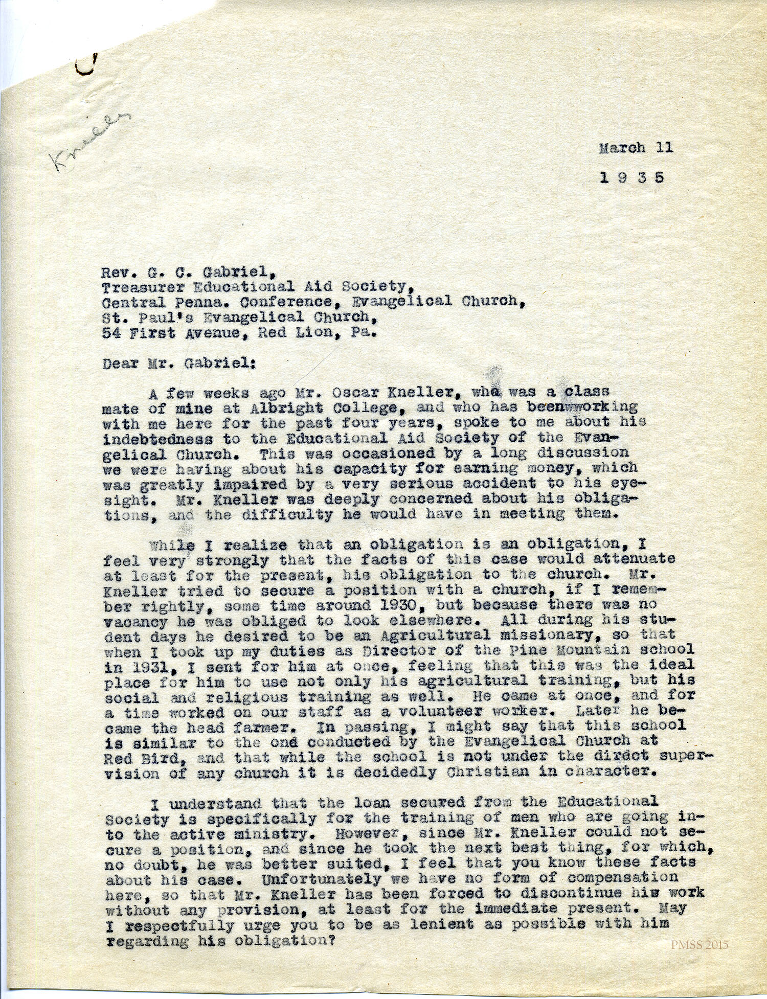 I understand that the loan secured from the Educational Society is specifically for the training of men who are going into the active ministry. However, since Mr. Kneller could not secure a position, and since he took the next best thing, for which, no doubt, he was better suited, I feel that you know these facts about his case. Unfortunately we have no form of compensation here, so that Mr. Kneller has been forced to discontinue his work without any provision, at least for the immediate present. May I respectfully urge you to be as lenient as possible with him regarding his obligation?