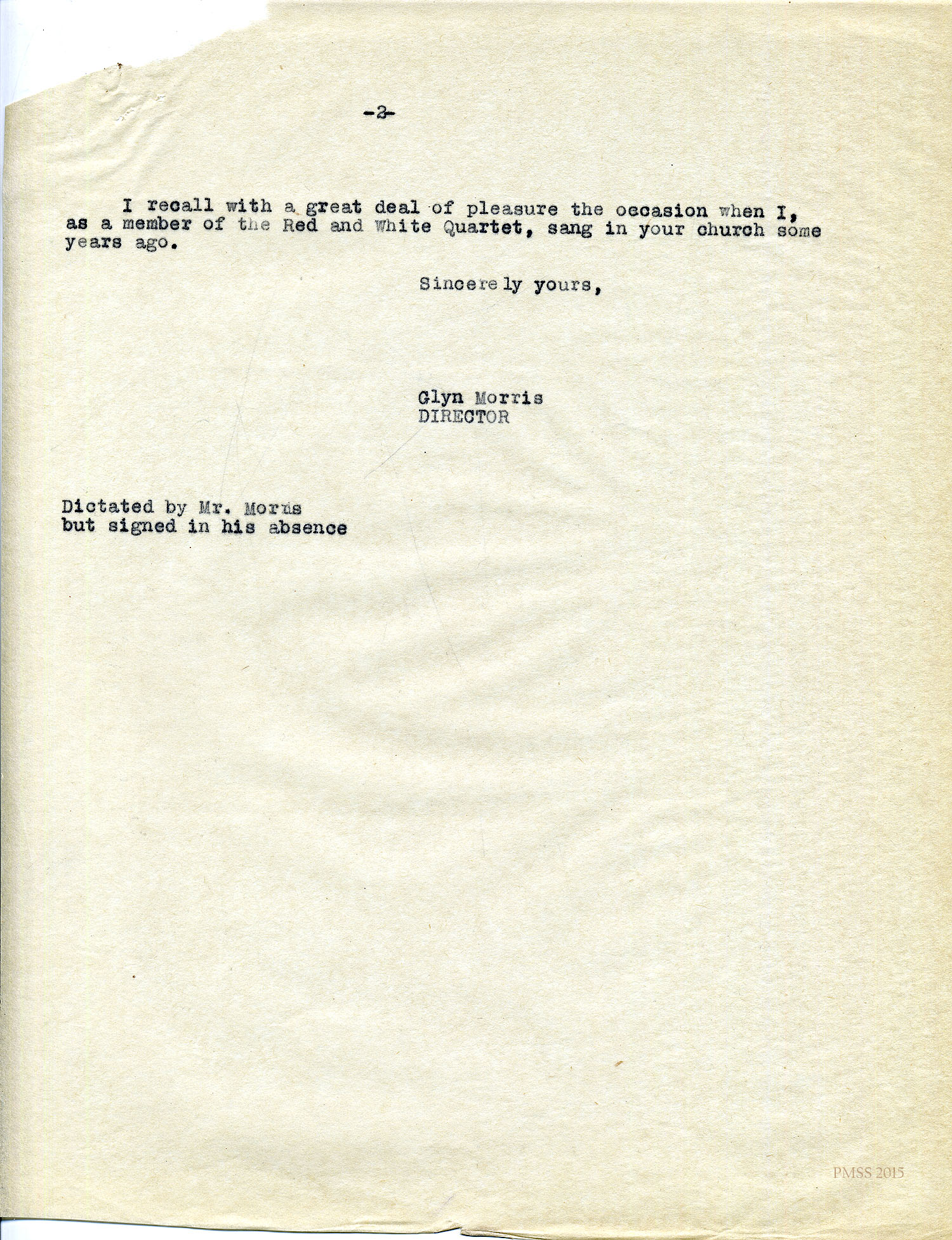 I recall with a great deal of pleasure the occasion when I, as a member of the Red and White Quartet, sang in your church some years ago.