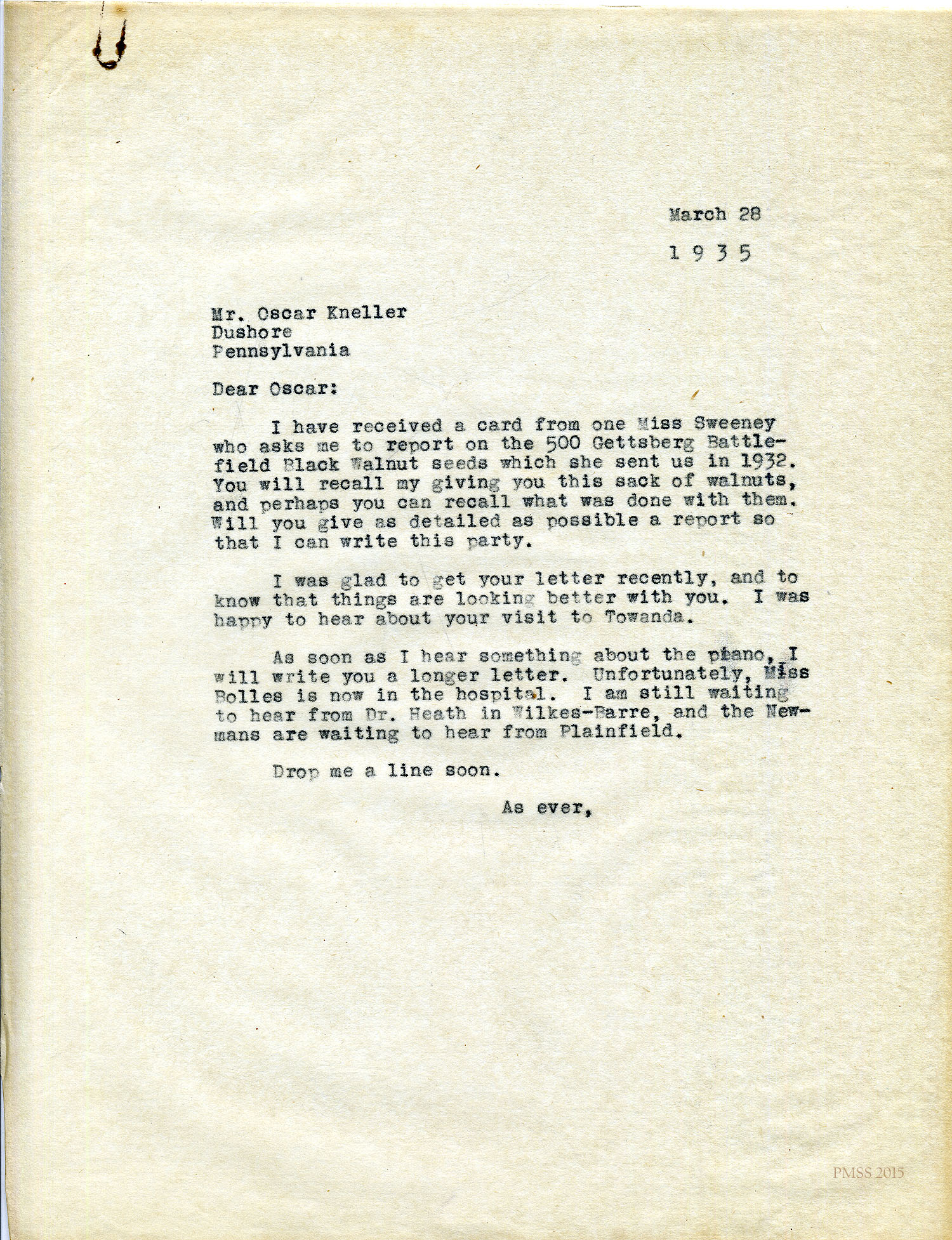 I have received a card from one Miss Sweeney who asks me to report on the 500 Gettsberg [Gettysburg?] Battlefield Black Walnut seeds which she sent us in 1932. You will recall my giving you this sack of walnuts, and perhaps you can recall what was done with them. Will you give as detailed as possible a report so that I can write this party.