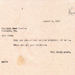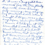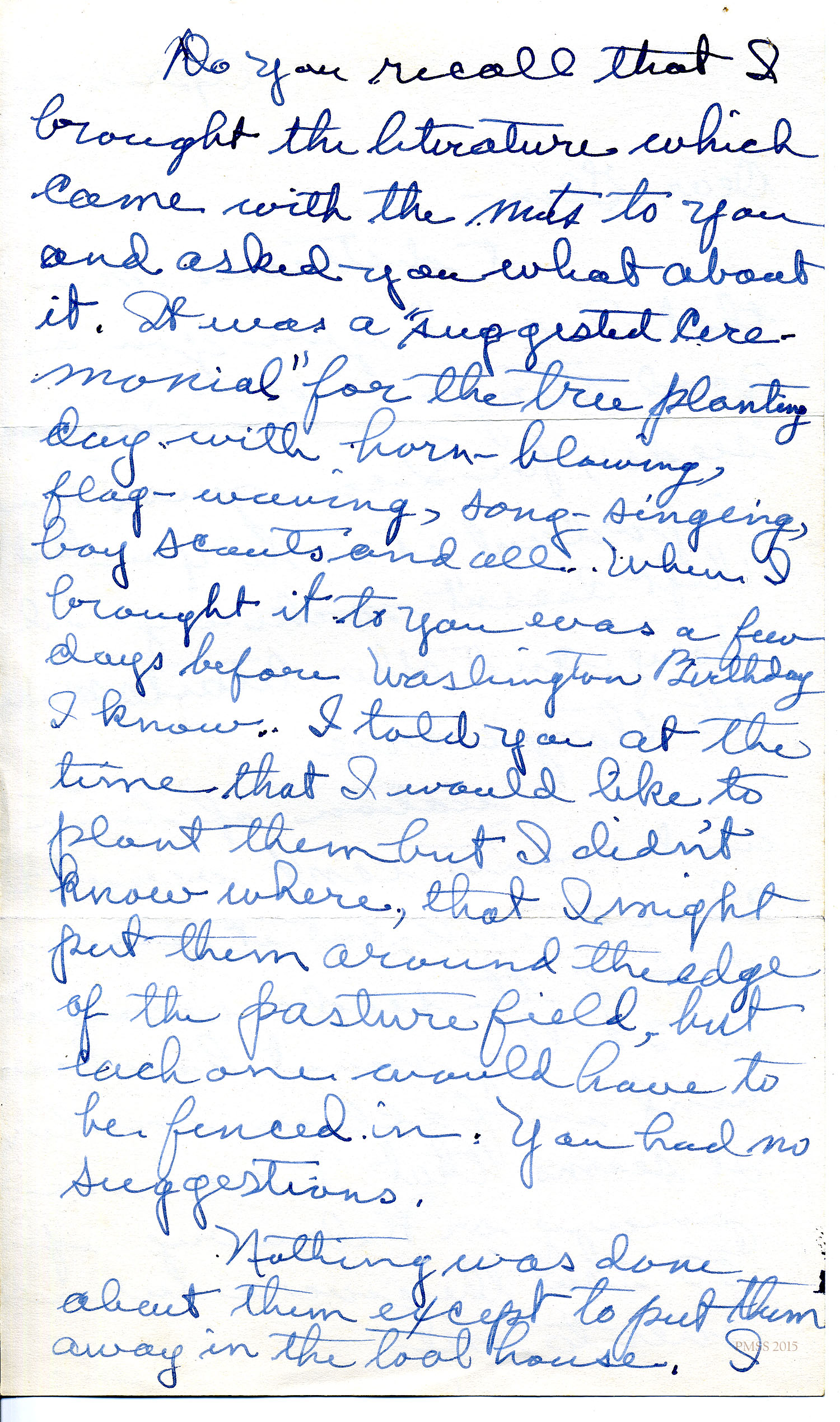 Do you recall that I brought the literature which came with the nuts to you and asked you what about it. It was a “suggested ceremonial” for the tree planting day with horn-blowing, flay-waving, song-singing, Boy Scouts and all. When I brought it to you [it] was a few days before Washington[‘s] Birthday I know. I told you at the time that I would like to plant them but I didn’t know where, that I might put them around the edge of the pasture field, but each one would have to be fenced in. You had no suggestions.